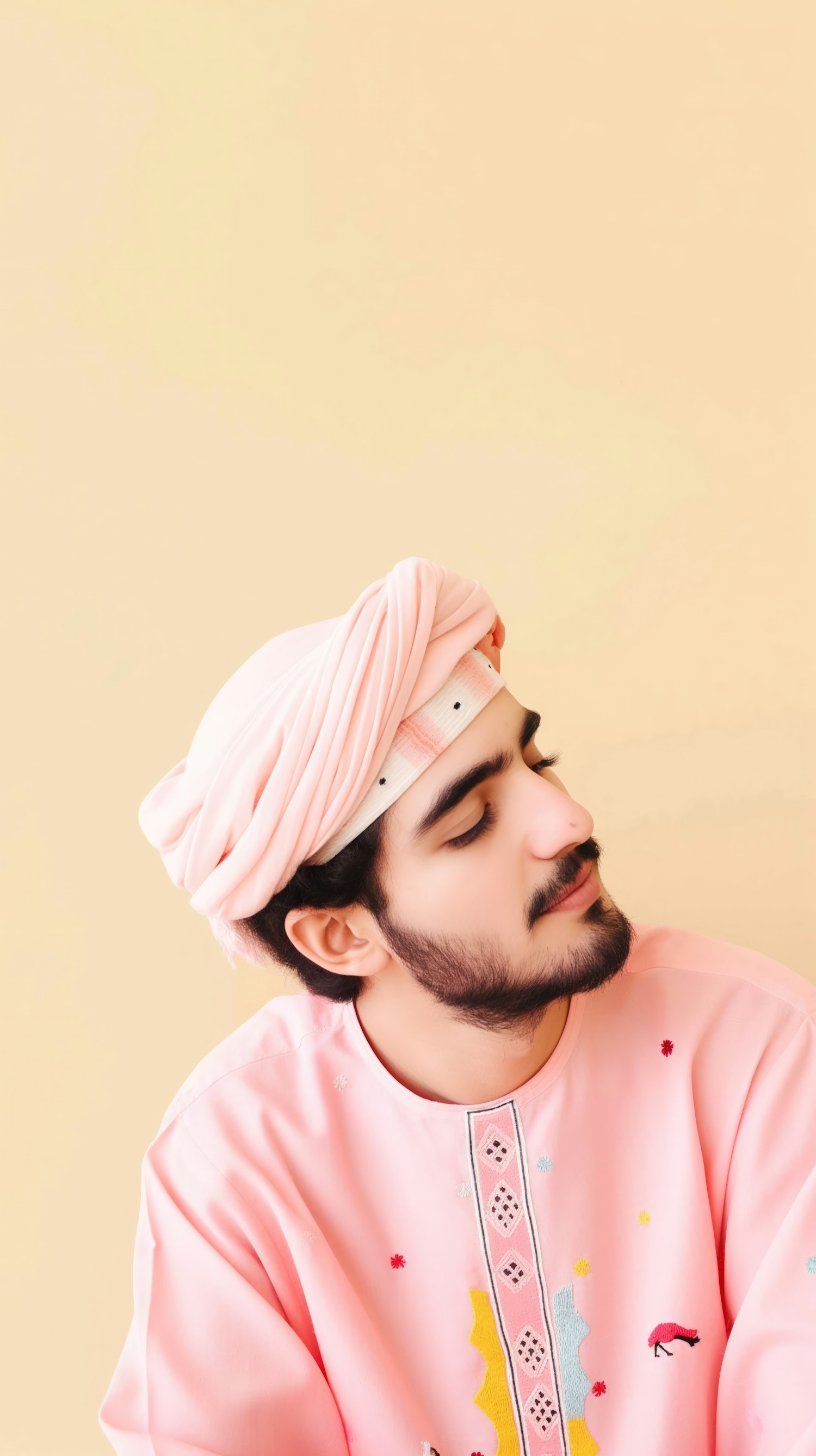 Middle Eastern man in pink traditional attire with a serene expression, set against a warm beige background.