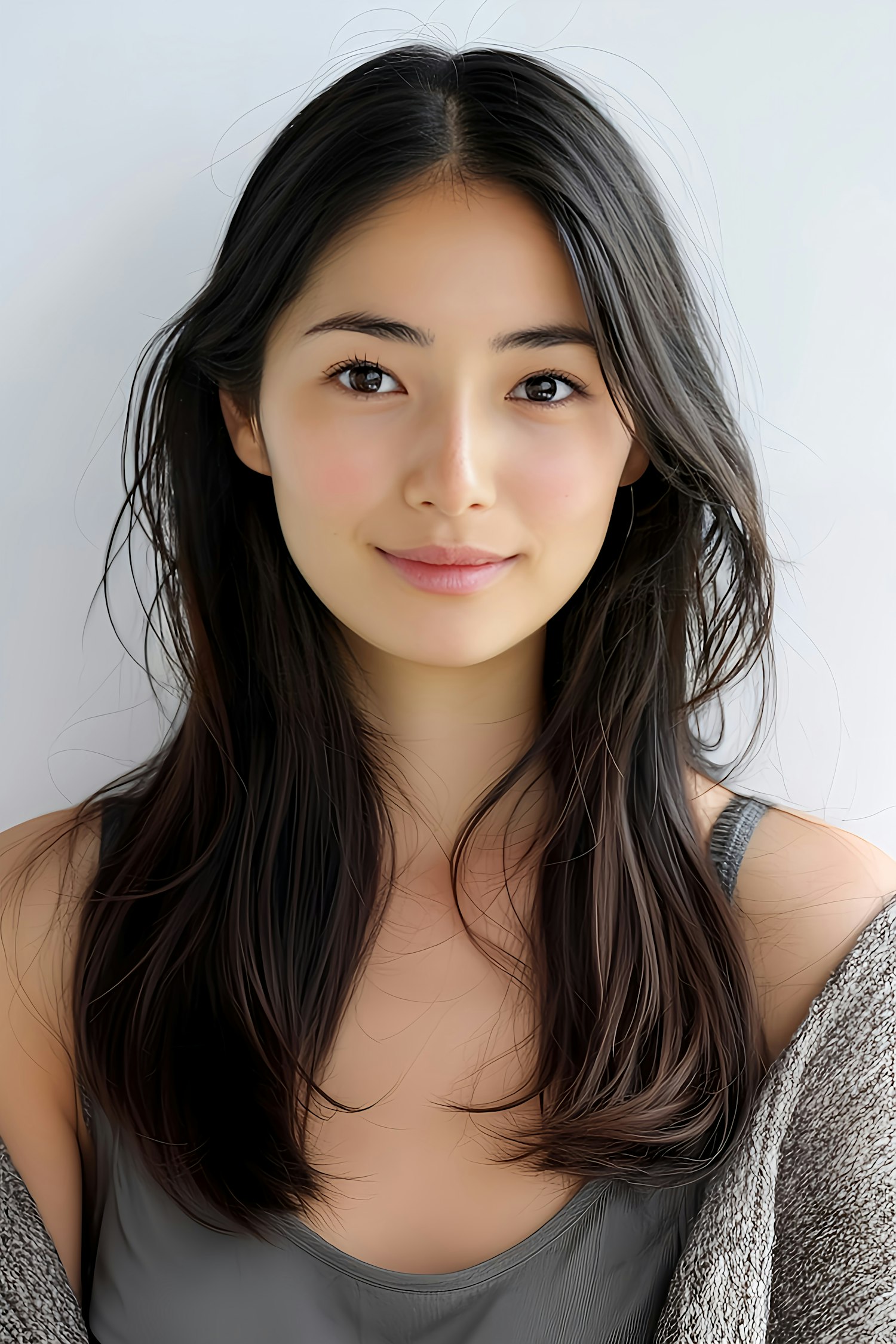 Portrait of a young Asian woman with long dark hair, wearing a gray tank top and cardigan, smiling gently against a light background.