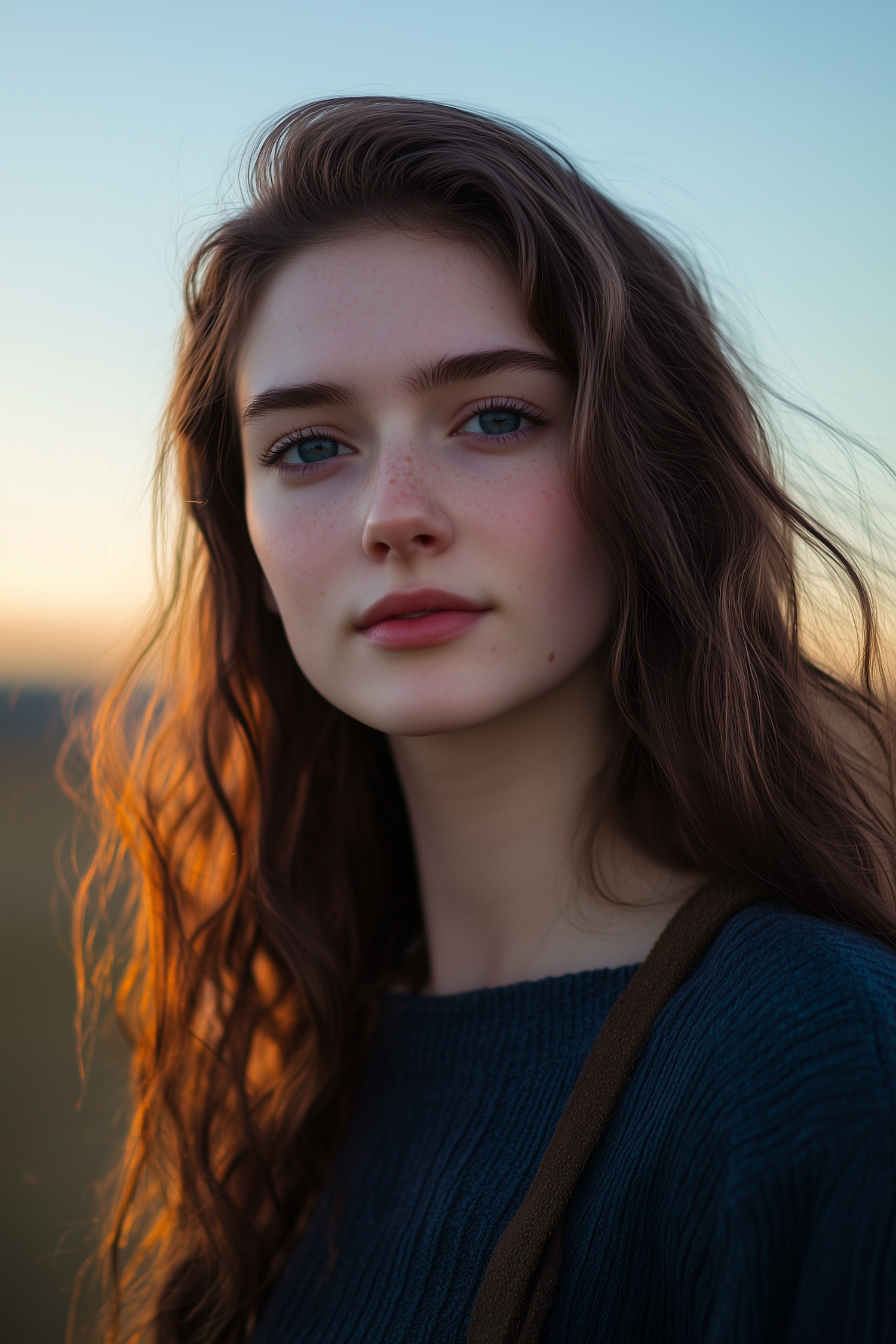 Portrait of a young woman with wavy brown hair and blue eyes, captured at sunset with a serene expression and warm lighting.