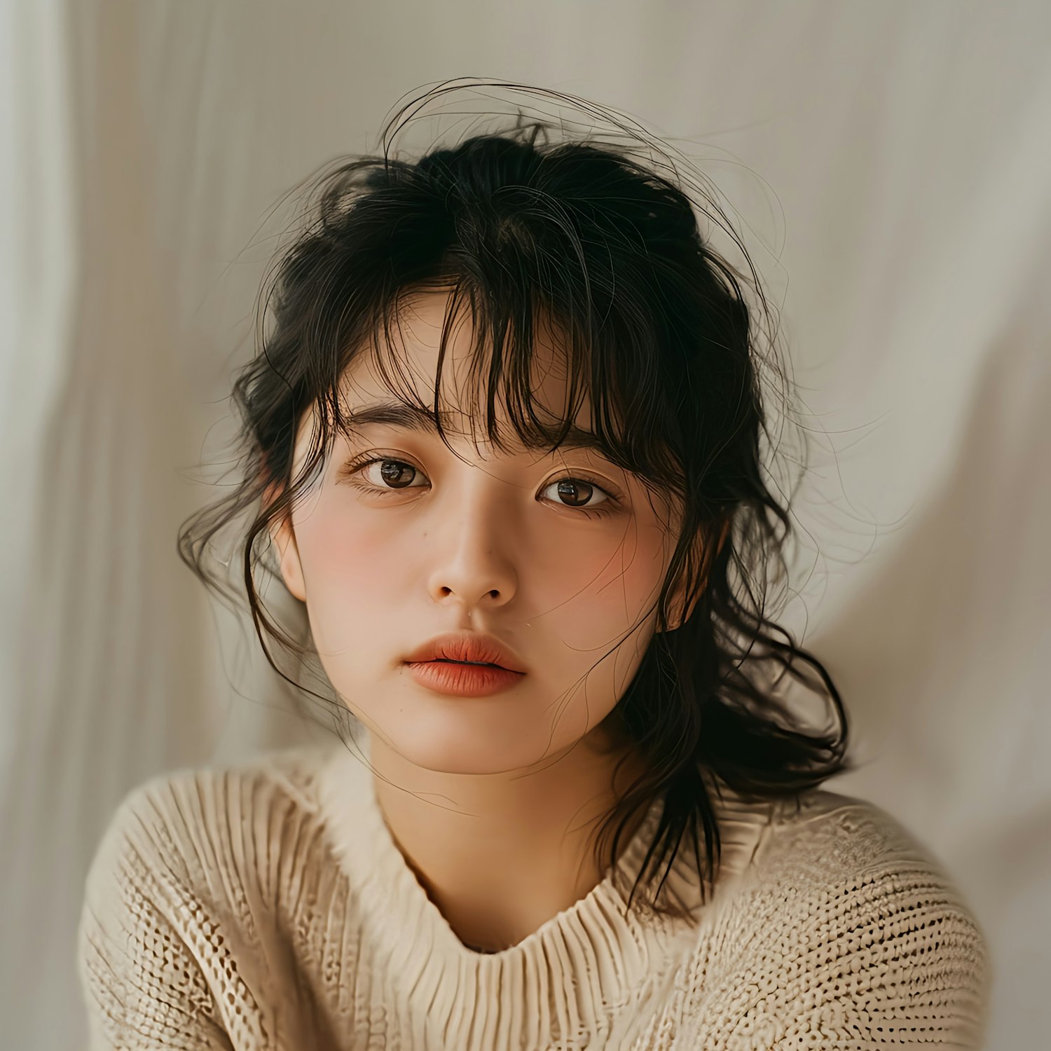Portrait of a young Asian woman with dark hair and fair skin, wearing a cream sweater. Her serene expression adds warmth to the scene.