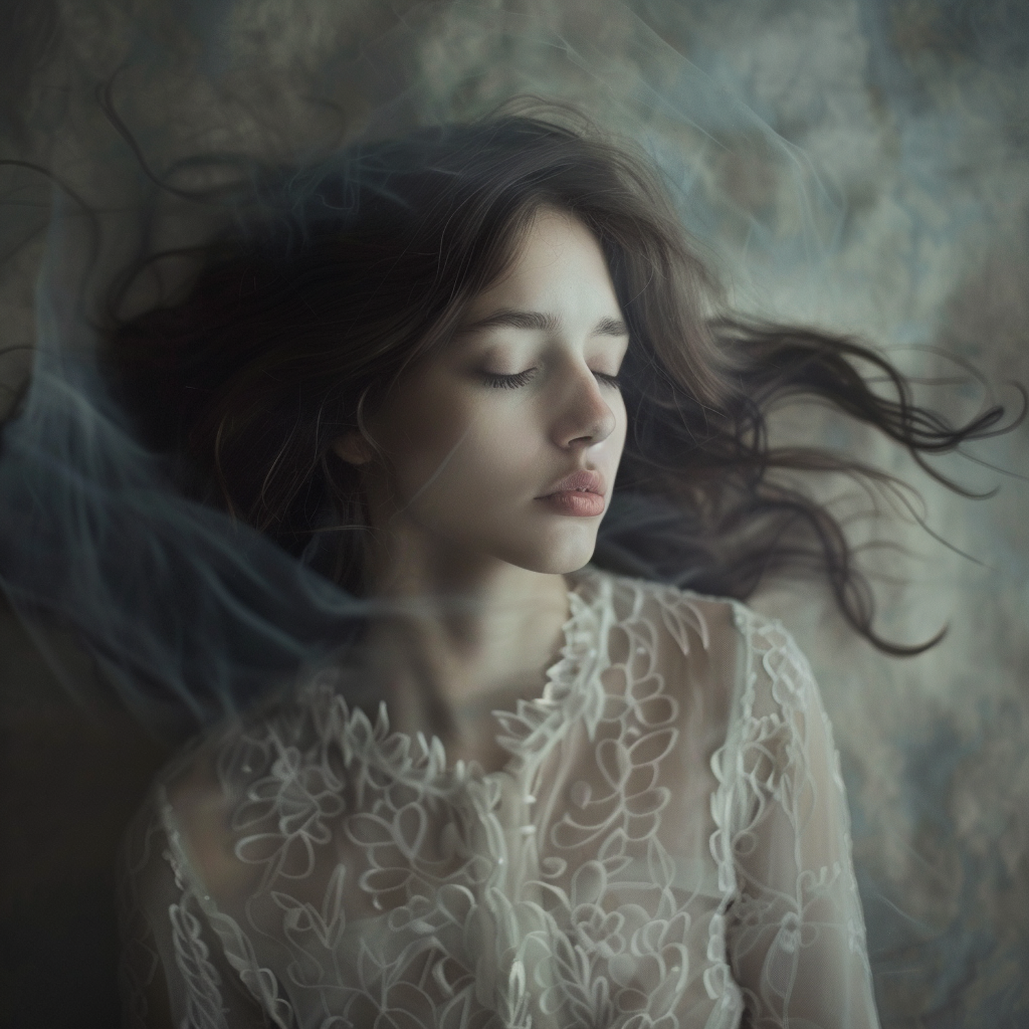 Serene portrait of a woman in a lace dress, eyes closed, surrounded by ethereal mist. Dreamlike and tranquil atmosphere.