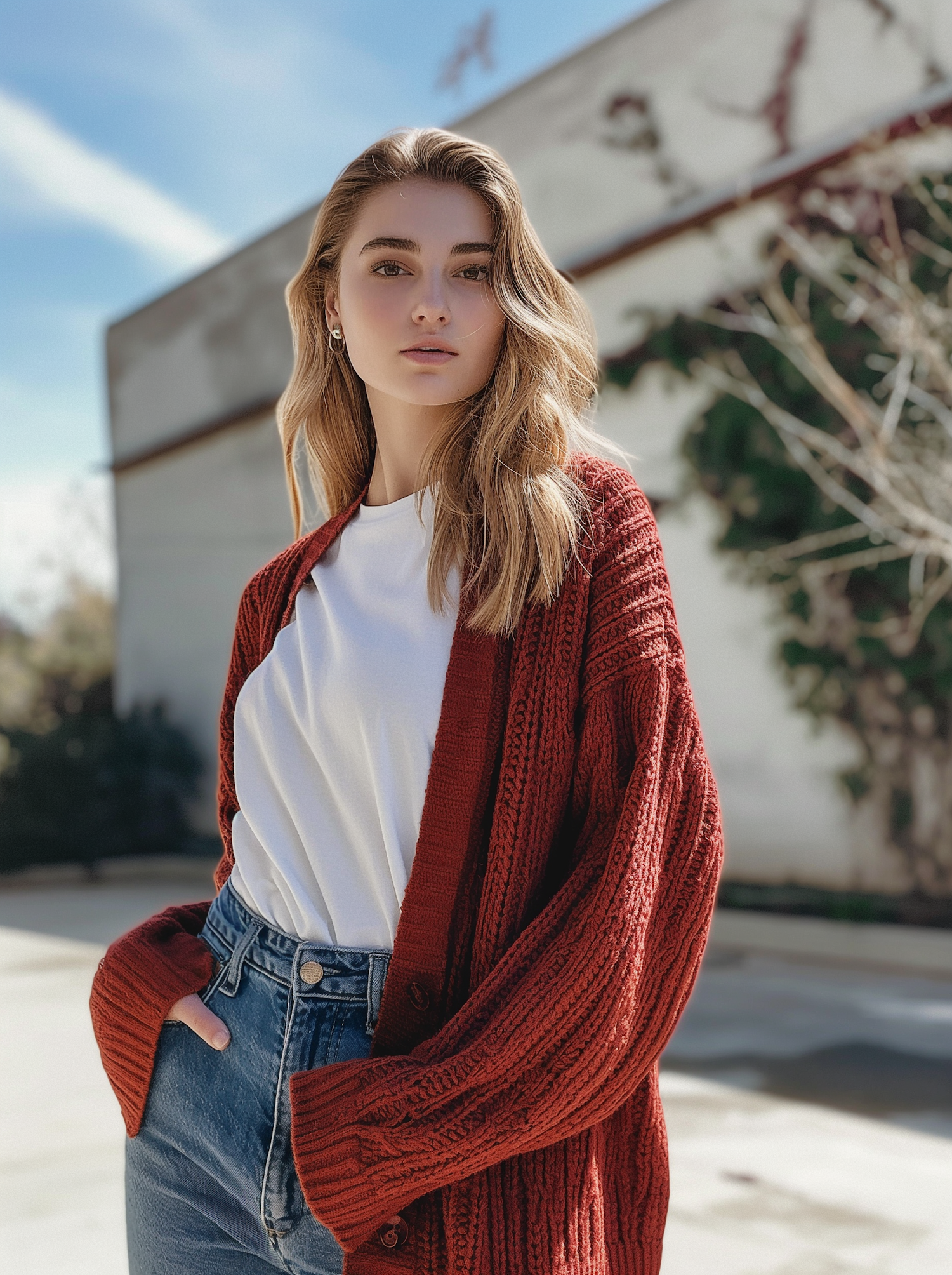Stylish woman in a red cardigan and jeans poses outdoors in natural light, exuding confidence and elegance.