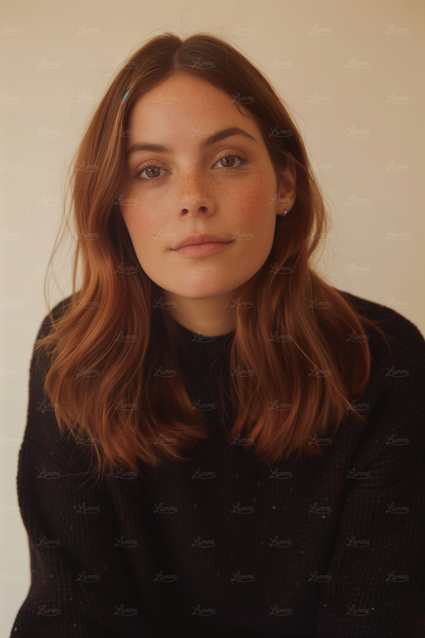 Portrait of a young woman with auburn hair, freckles, and light brown eyes, wearing a black sweater against a beige background.
