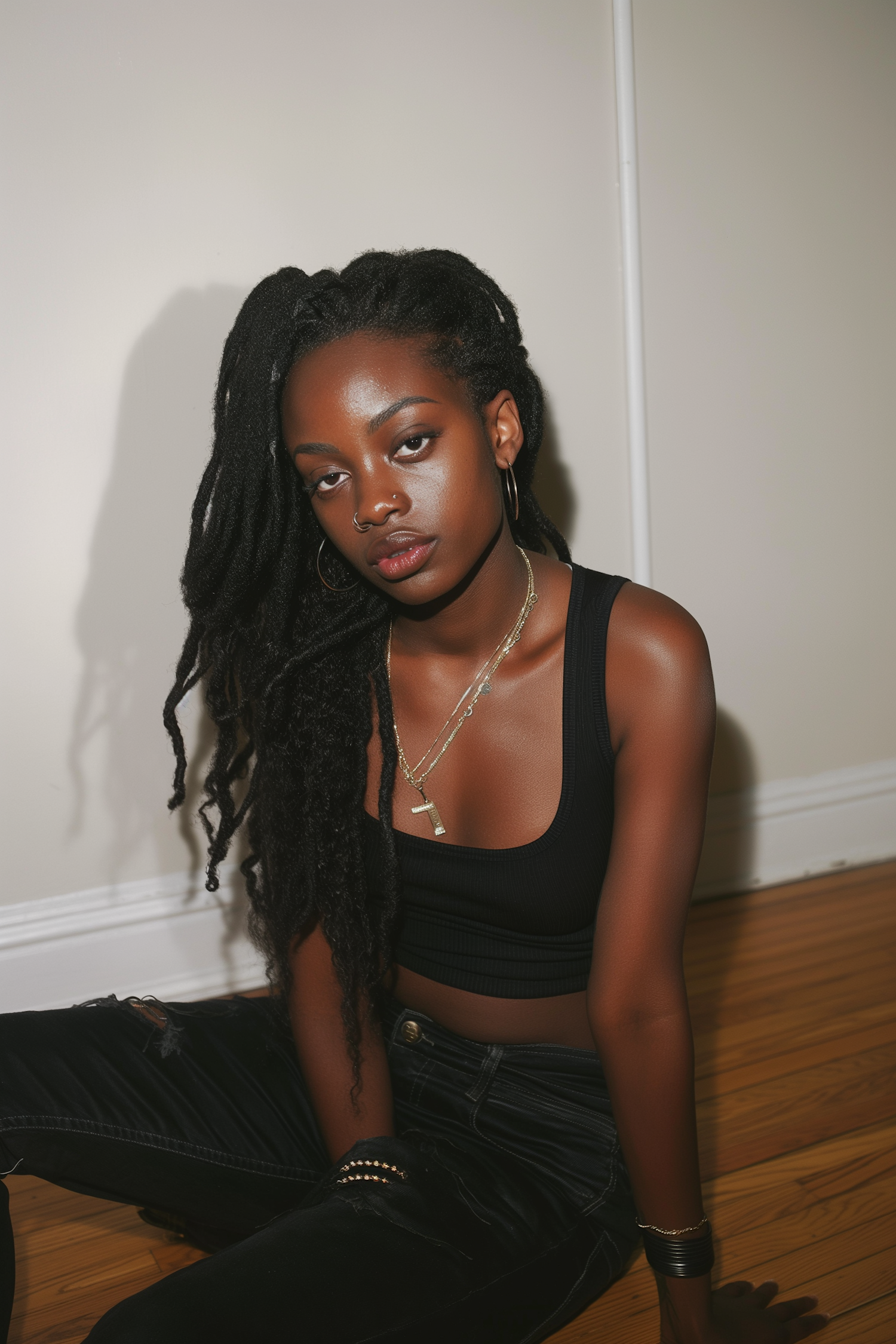 Young woman with dreadlocks and gold jewelry sitting on a wooden floor, exuding confidence and style.