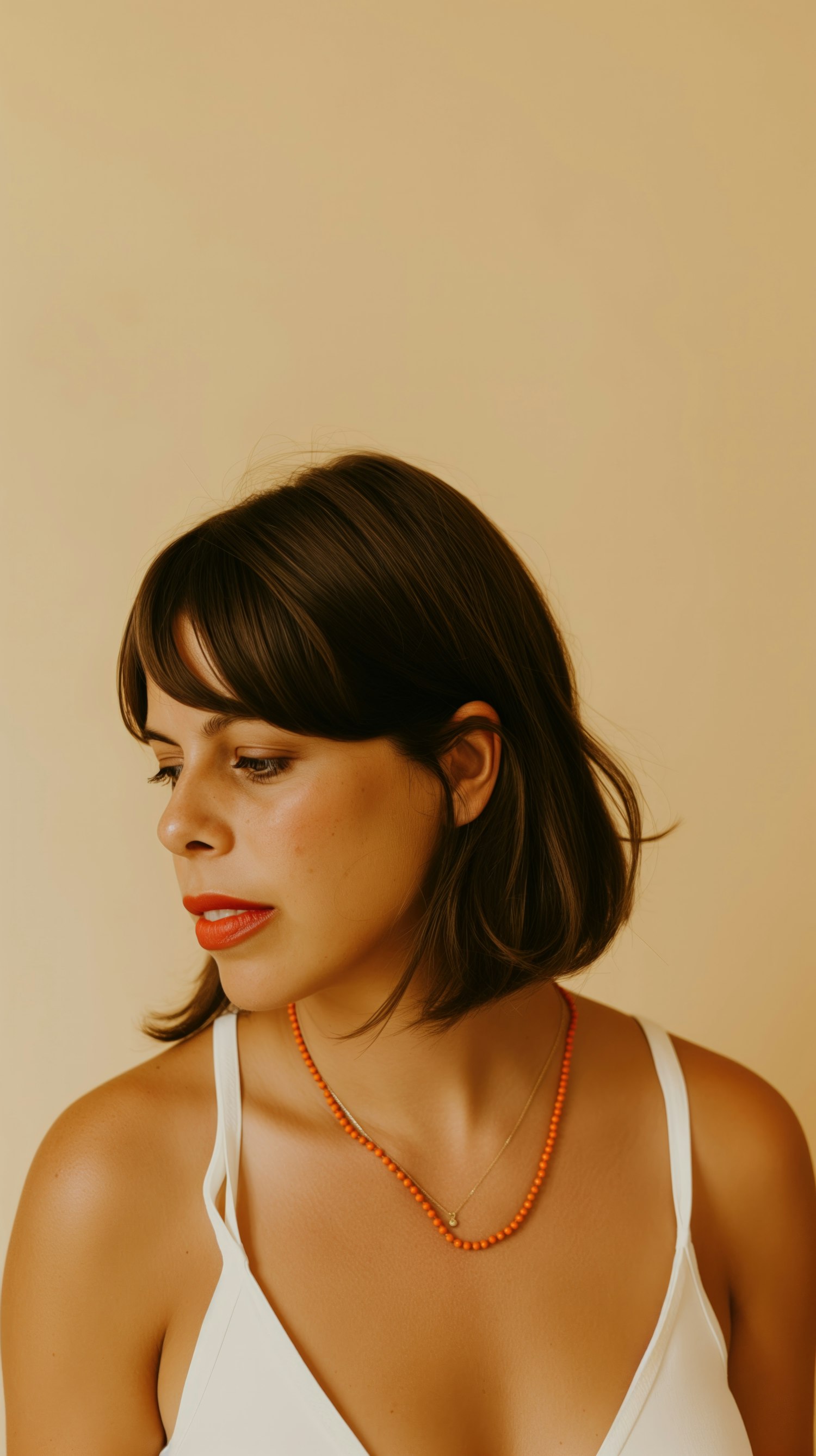Thoughtful woman with short dark hair, red lips, and orange necklace against a beige background. Elegant and serene portrait.