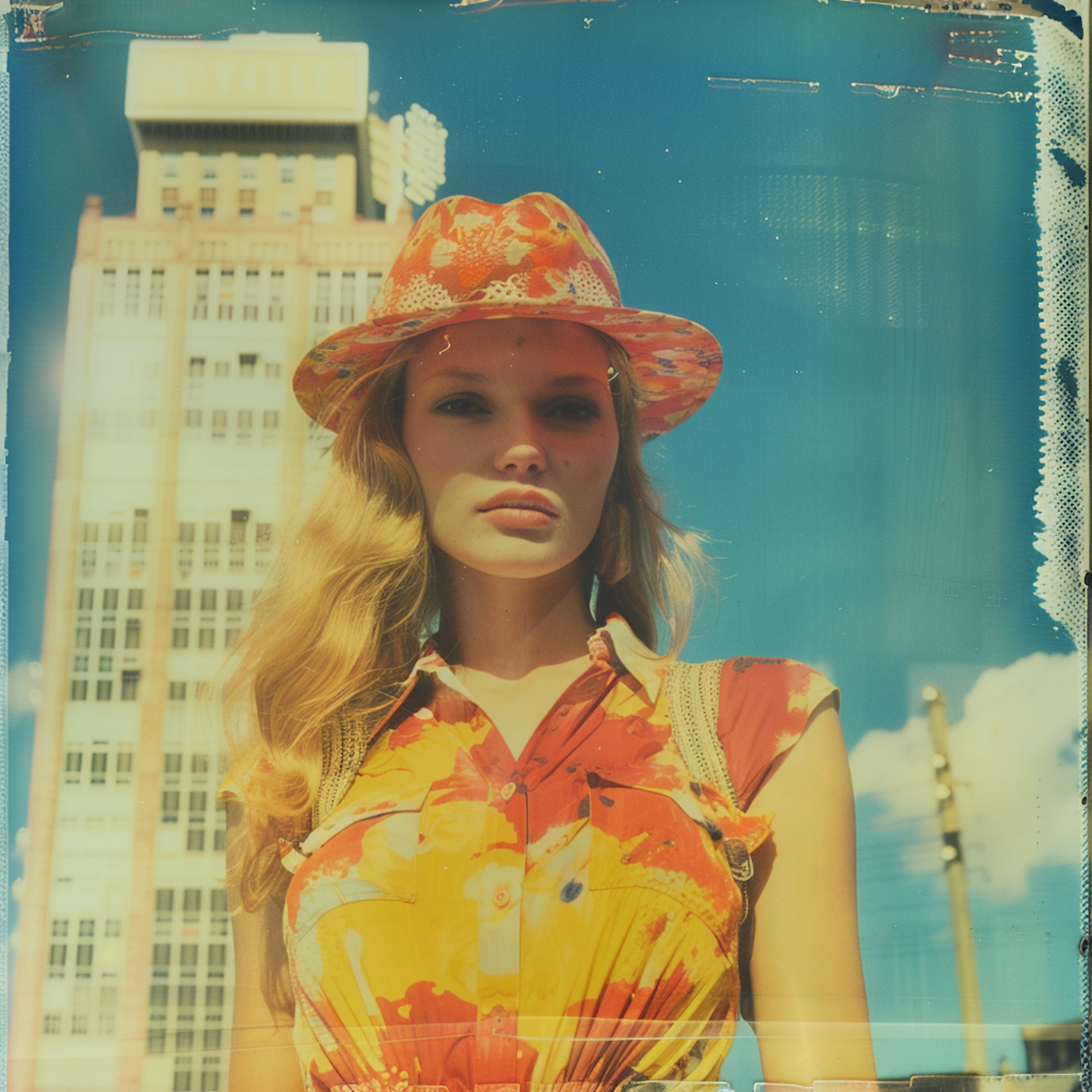 Young woman in vibrant floral dress and hat stands against a bright blue sky with a retro building in the background.