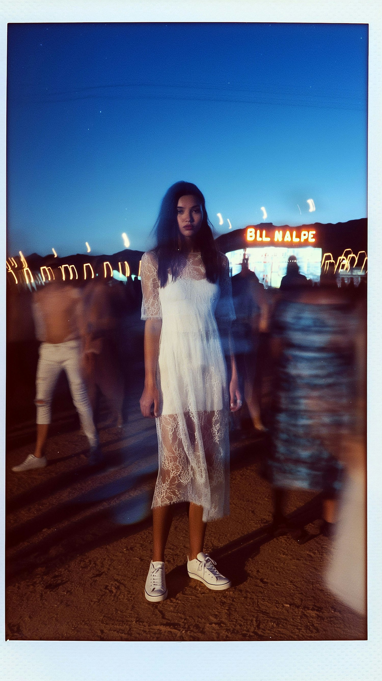 A woman in a white lace dress stands amidst a blurred crowd at twilight, with a neon sign glowing in the background.