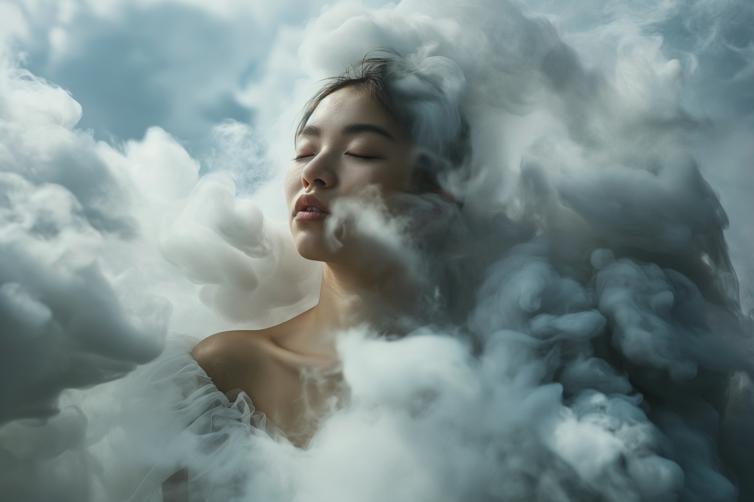 A serene Asian woman surrounded by ethereal clouds, eyes closed in peaceful tranquility. Dreamlike atmosphere with soft, cool tones.