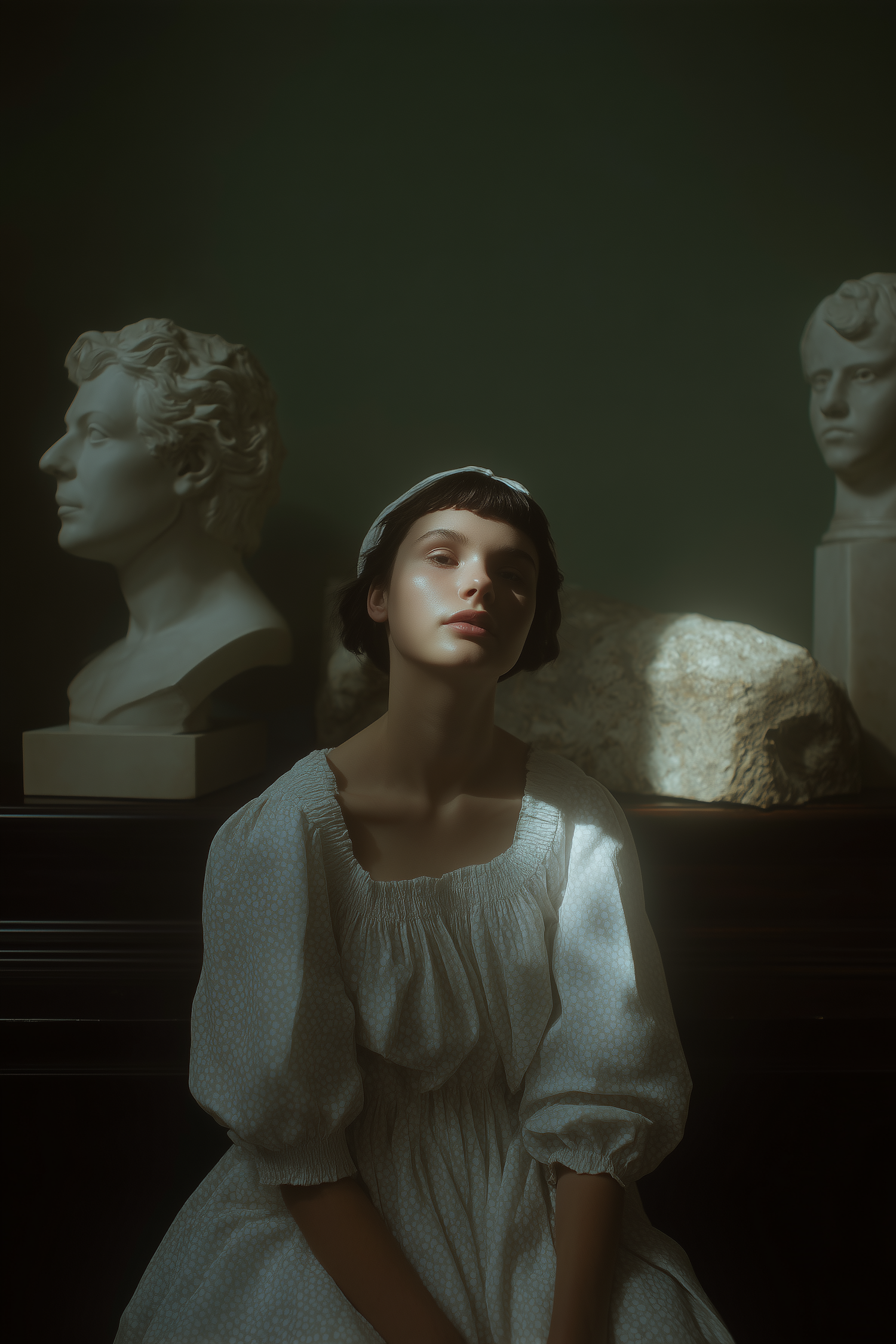 A serene portrait of a person surrounded by classical sculptures in soft lighting, evoking a timeless and artistic ambiance.