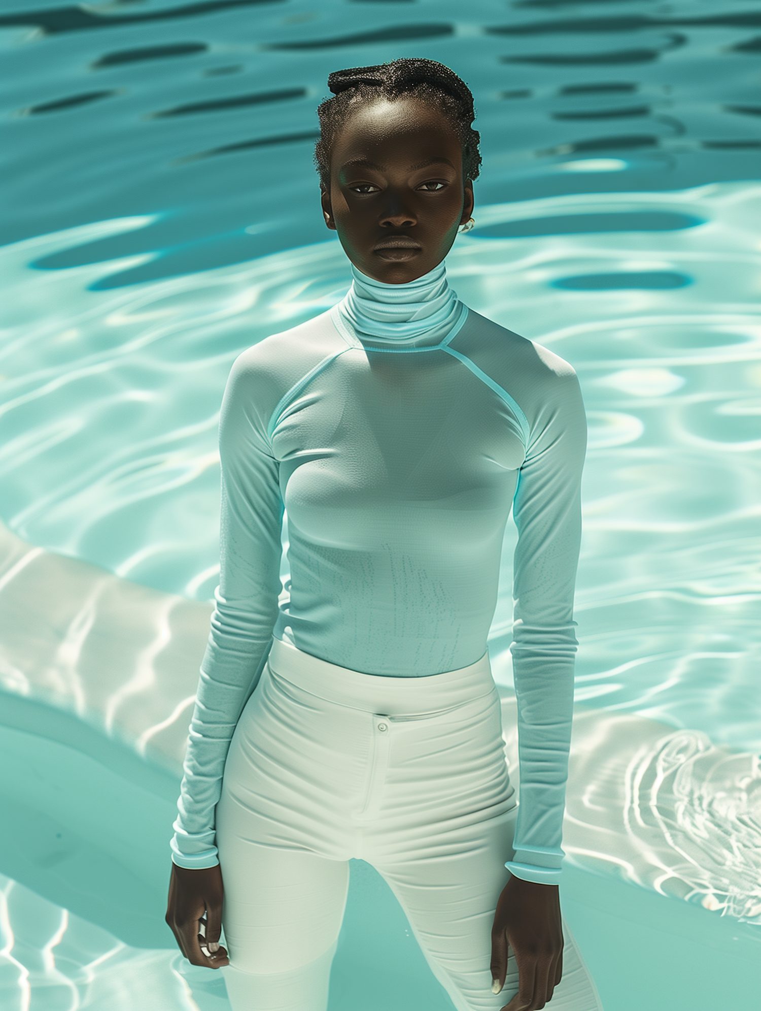 A young woman in aqua and white stands by a shimmering pool, her braided hair and calm expression highlighted by sunlight.