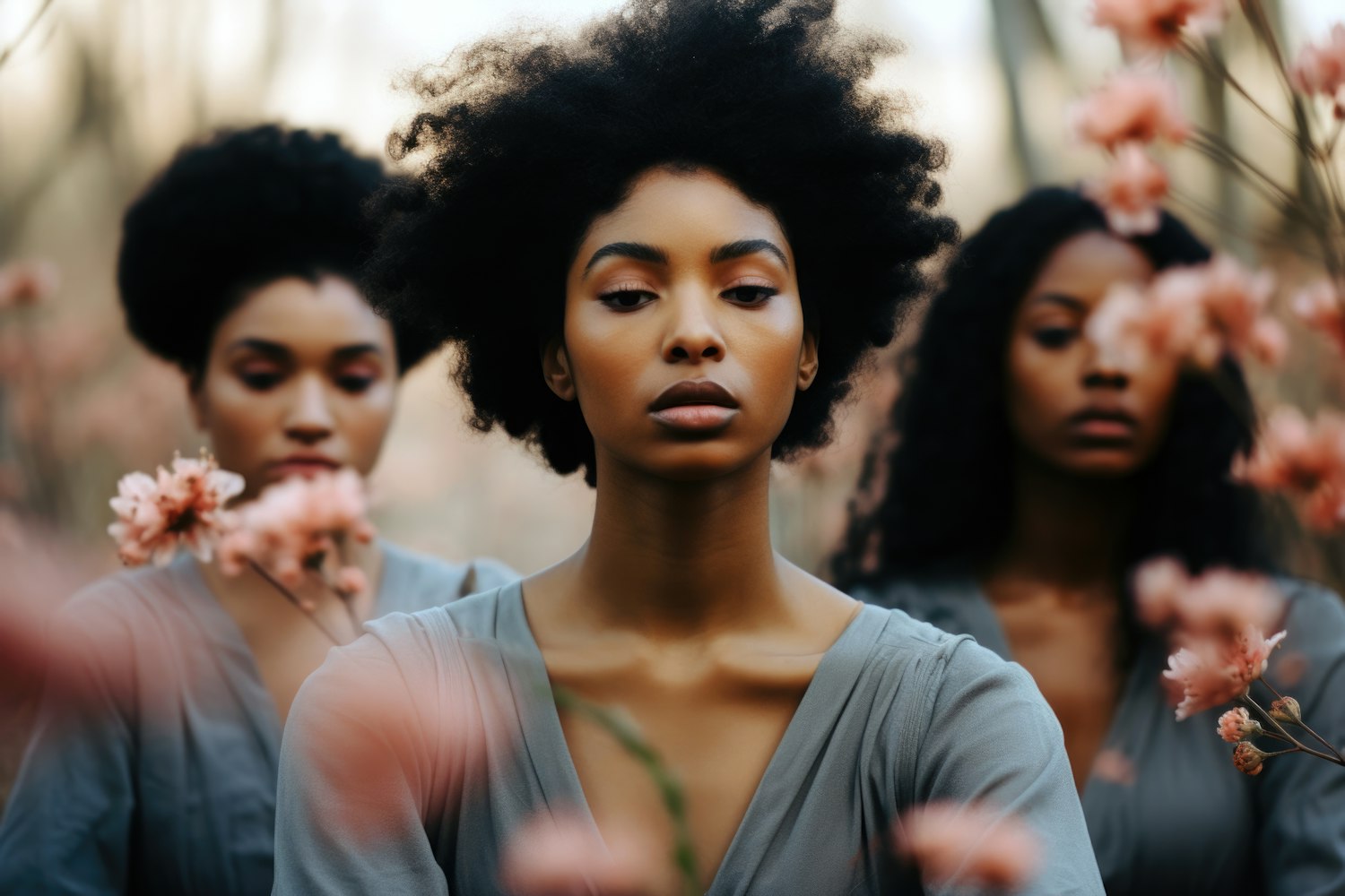Three Black women in a serene floral setting, wearing gray dresses, with natural hairstyles, creating a harmonious and peaceful scene.