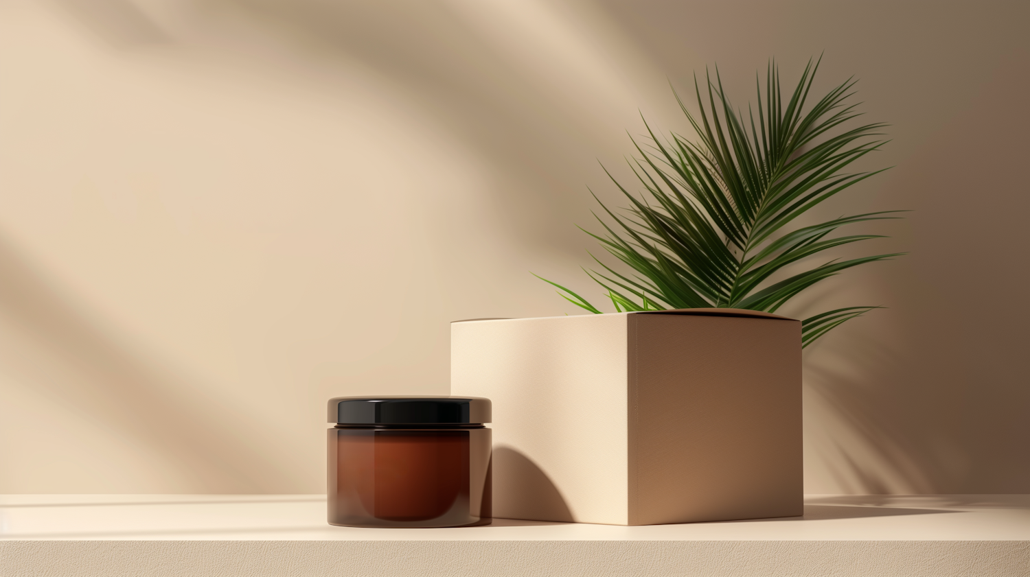 Minimalist scene with a brown jar and green plant in a beige planter on a light surface, creating a warm, calming atmosphere.