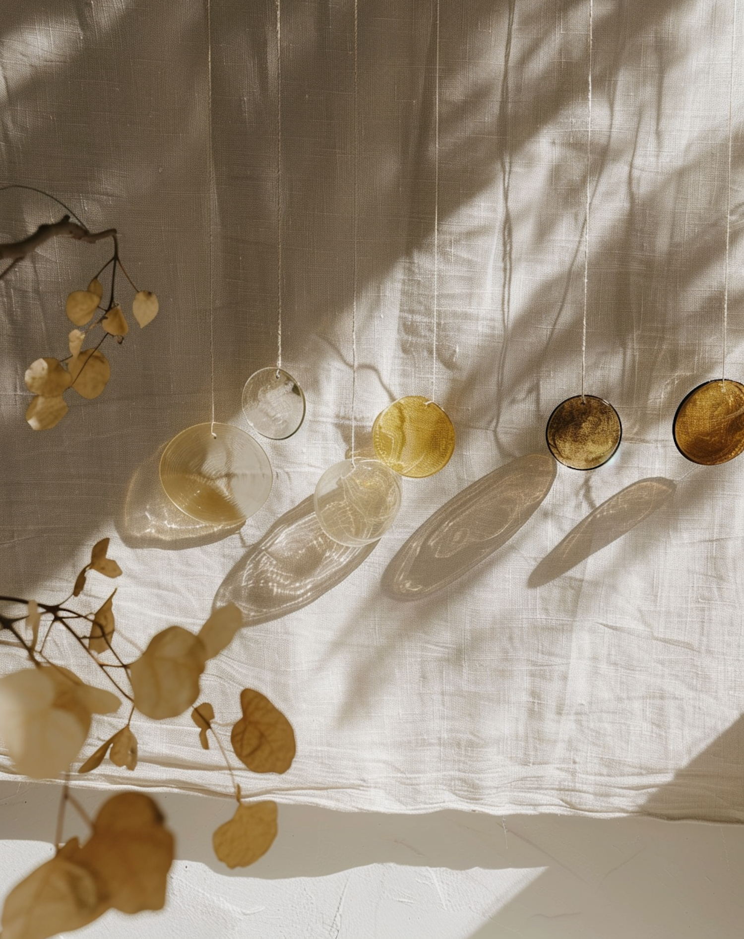 Translucent ornaments and dried leaves cast soft shadows on a textured fabric, creating a serene play of light and shadow.