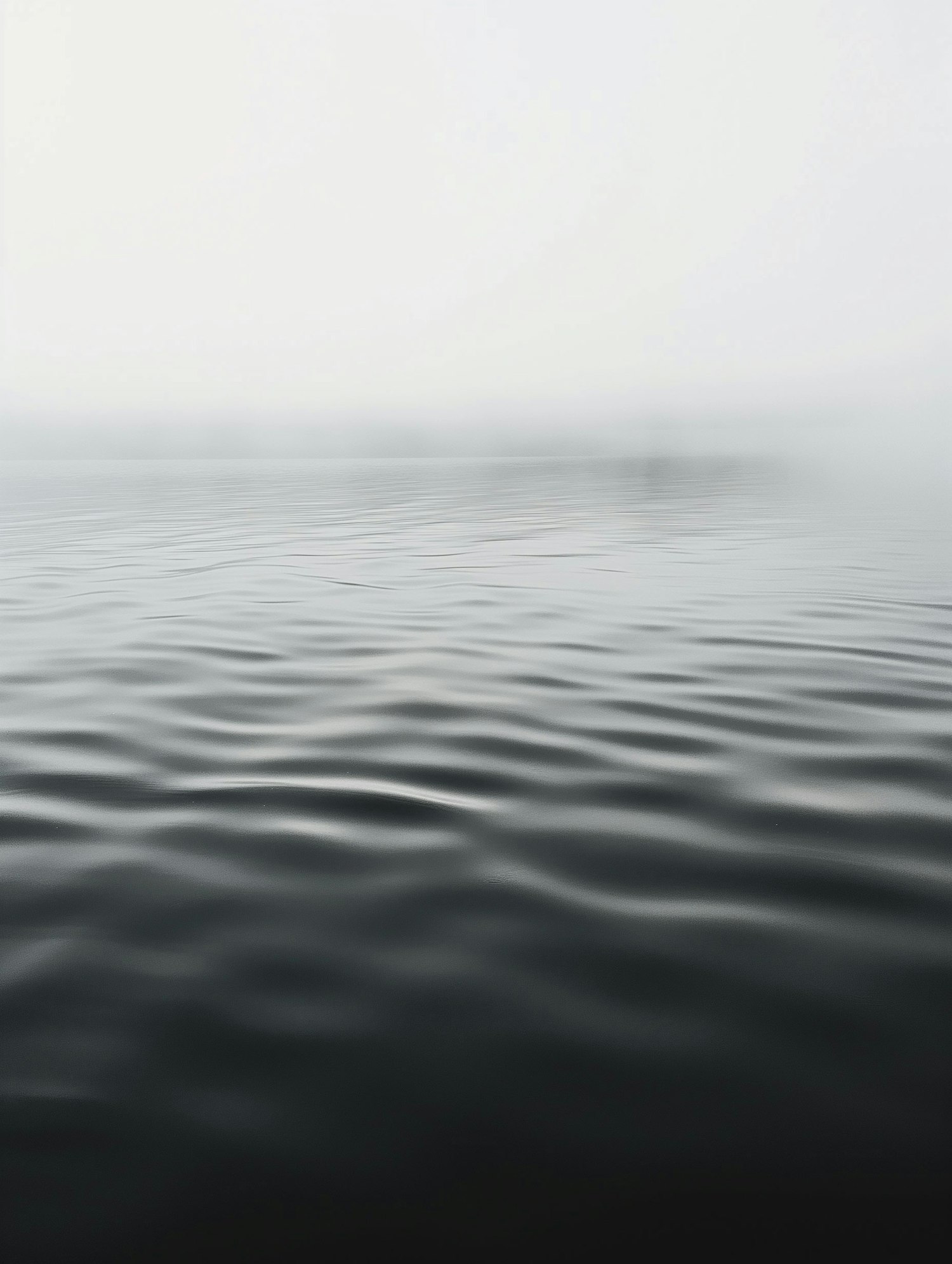 Serene water scene with gentle ripples and misty horizon, creating a tranquil and minimalist atmosphere.