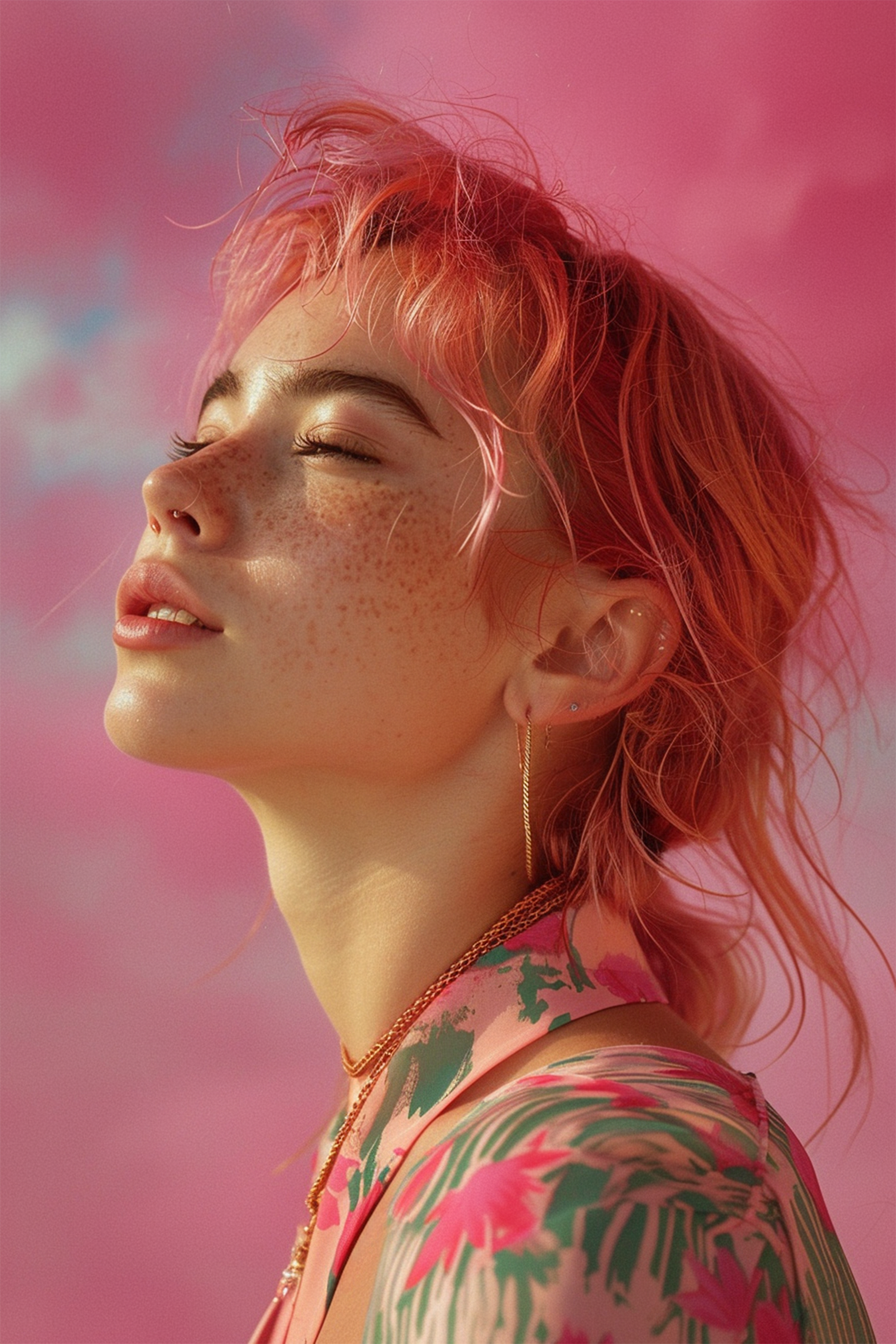 Serene portrait of a freckled woman with pink hair against a soft pink background, wearing floral attire and gold jewelry.