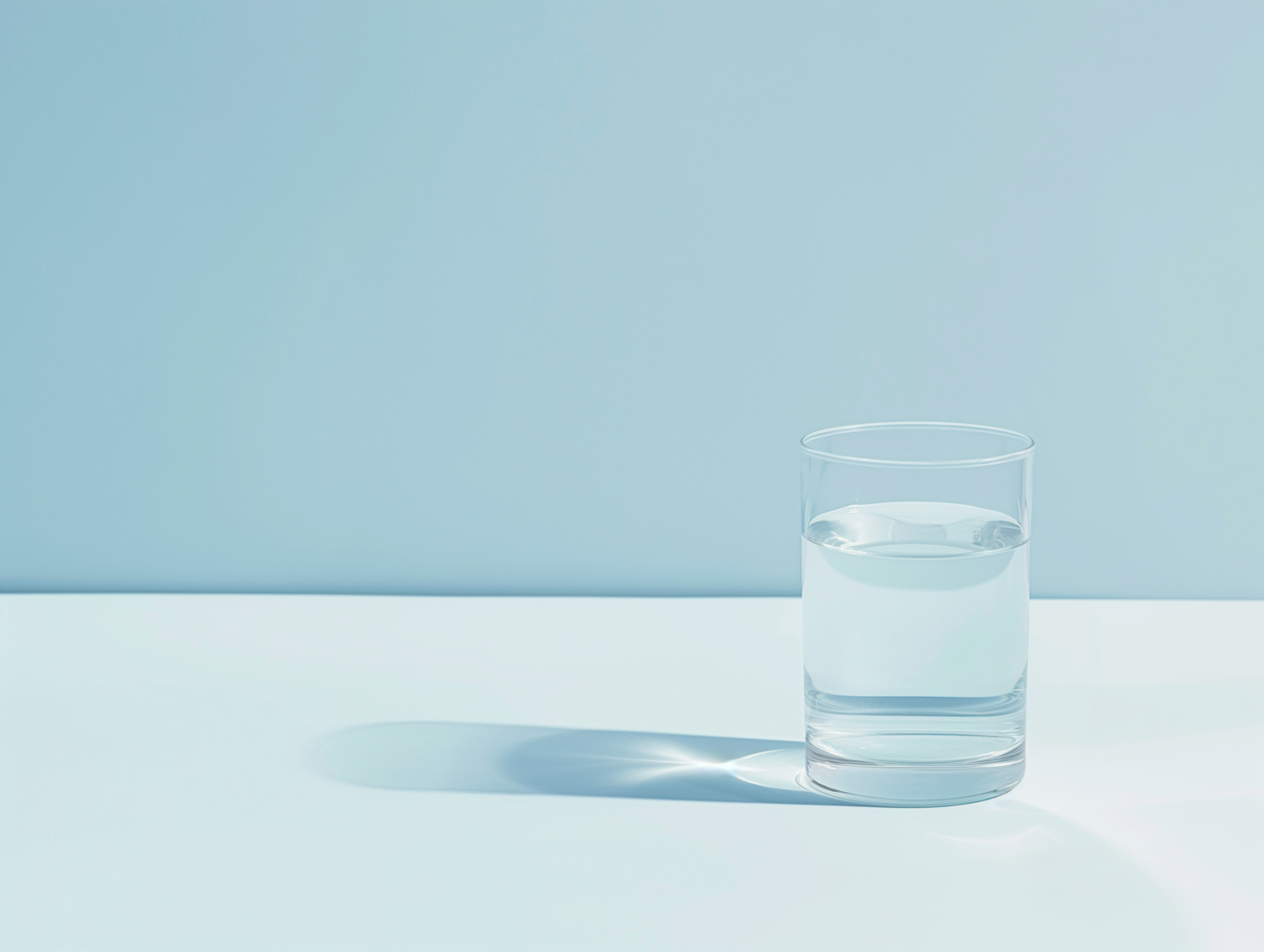 Minimalist image of a clear glass of water on a light blue surface, casting a soft shadow. Clean and serene composition.