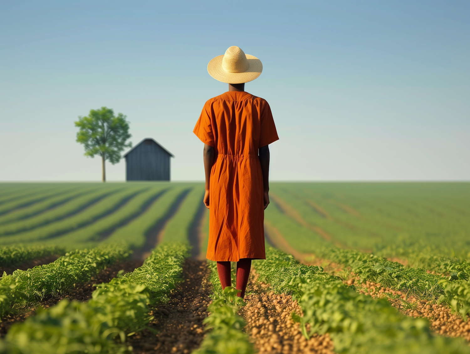 Person in orange dress and straw hat stands in a lush green field, facing a distant barn and tree under a clear blue sky.