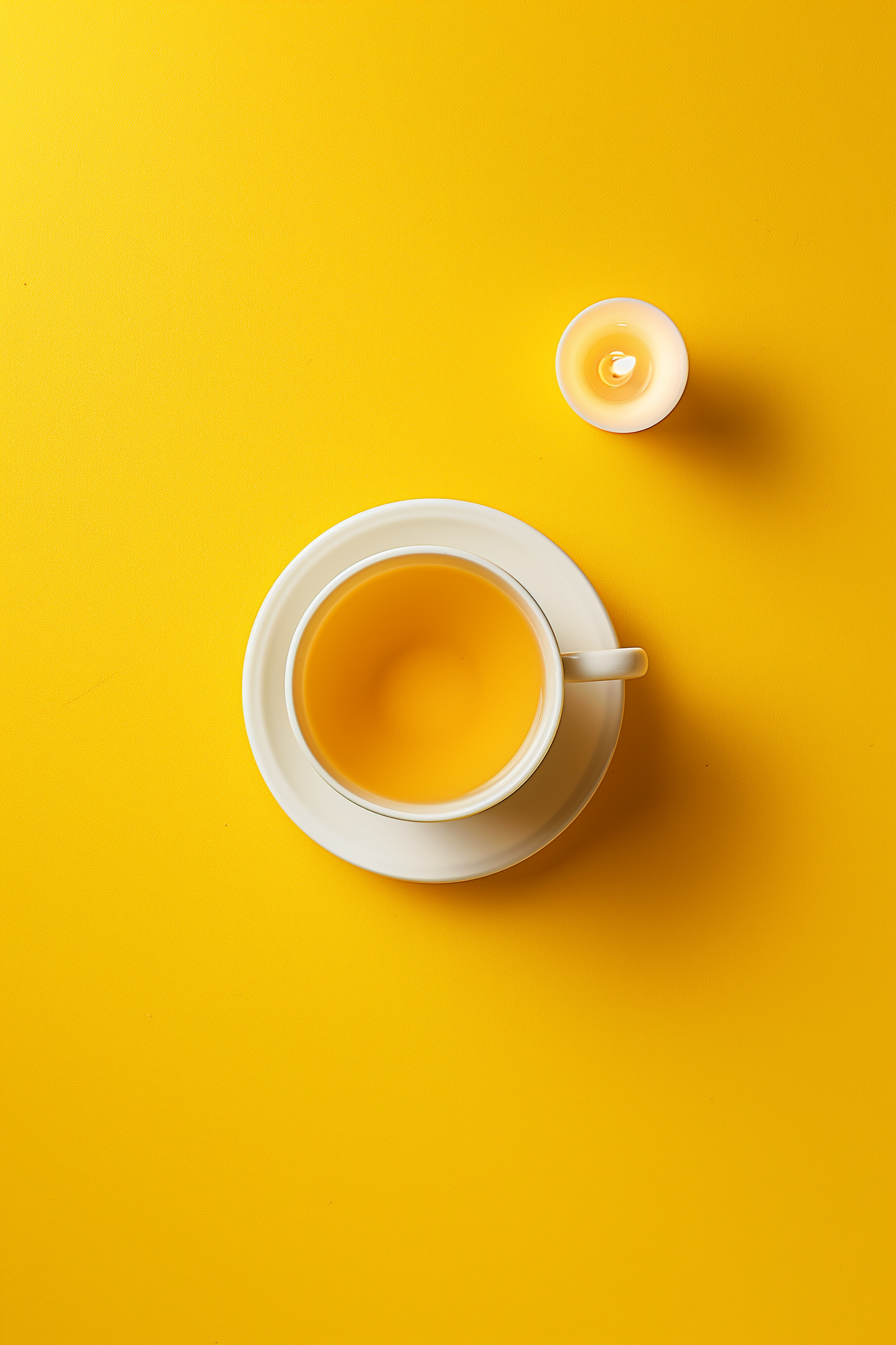 Minimalistic scene with a white cup of yellow liquid and a lit candle on a vibrant yellow background.