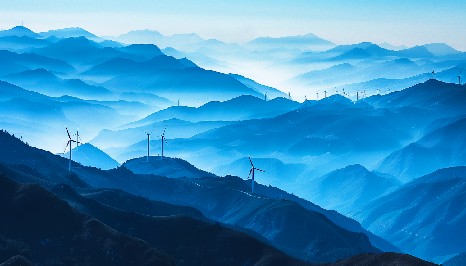 Serene blue landscape with wind turbines on rolling hills, creating a harmonious blend of nature and technology.
