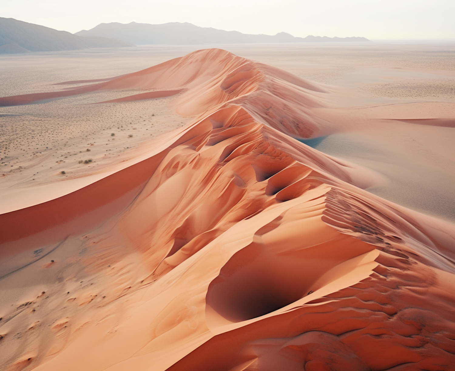 Stunning desert landscape with towering orange sand dunes and distant mountains under a clear sky.
