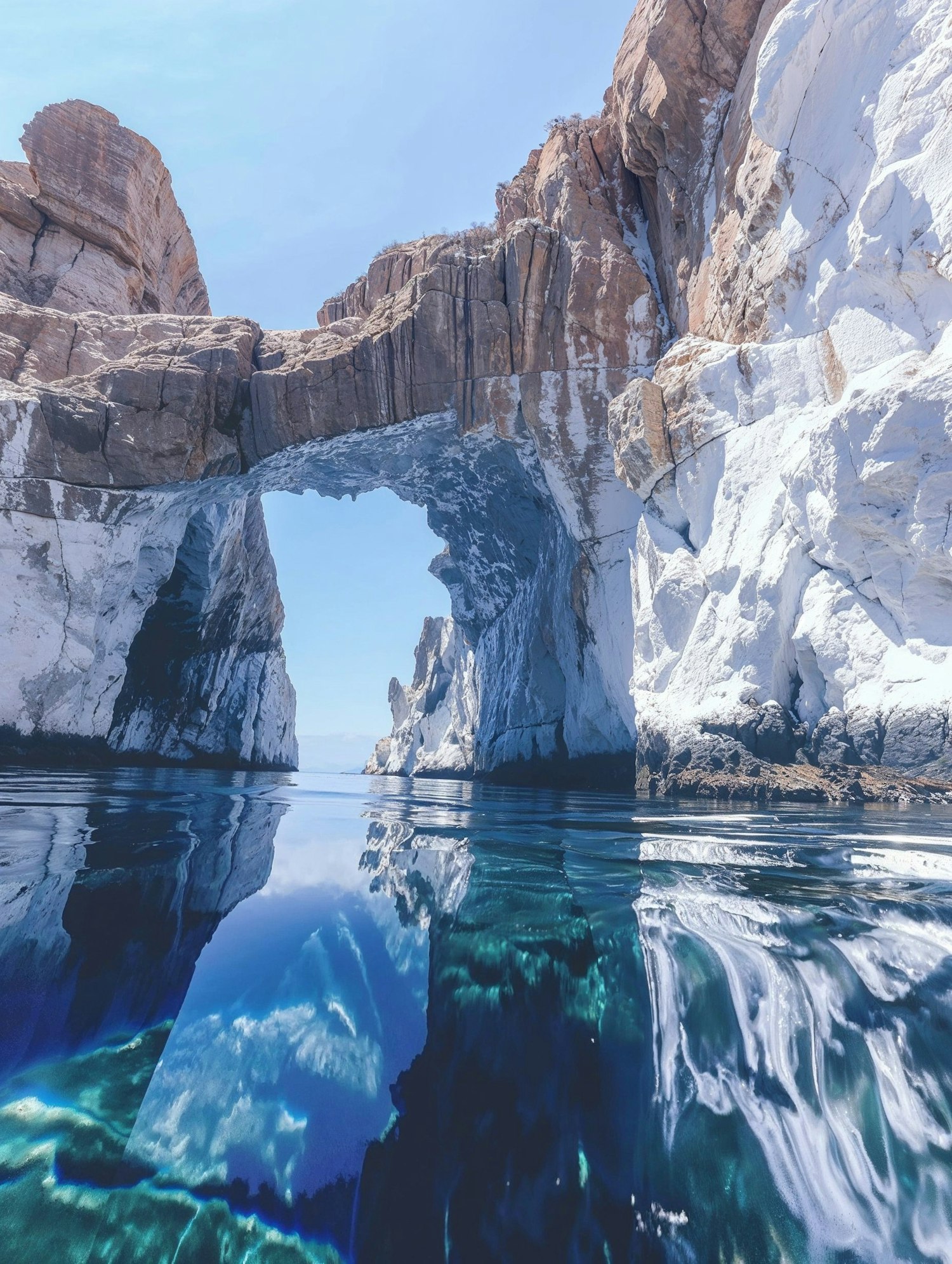 Majestic rock arch over calm blue waters, reflecting the sky and rugged formations. A serene and breathtaking natural scene.
