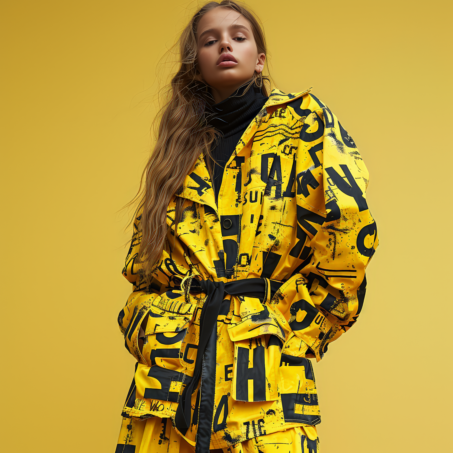 Stylish woman in a bold yellow and black outfit with abstract designs, standing against a yellow background.