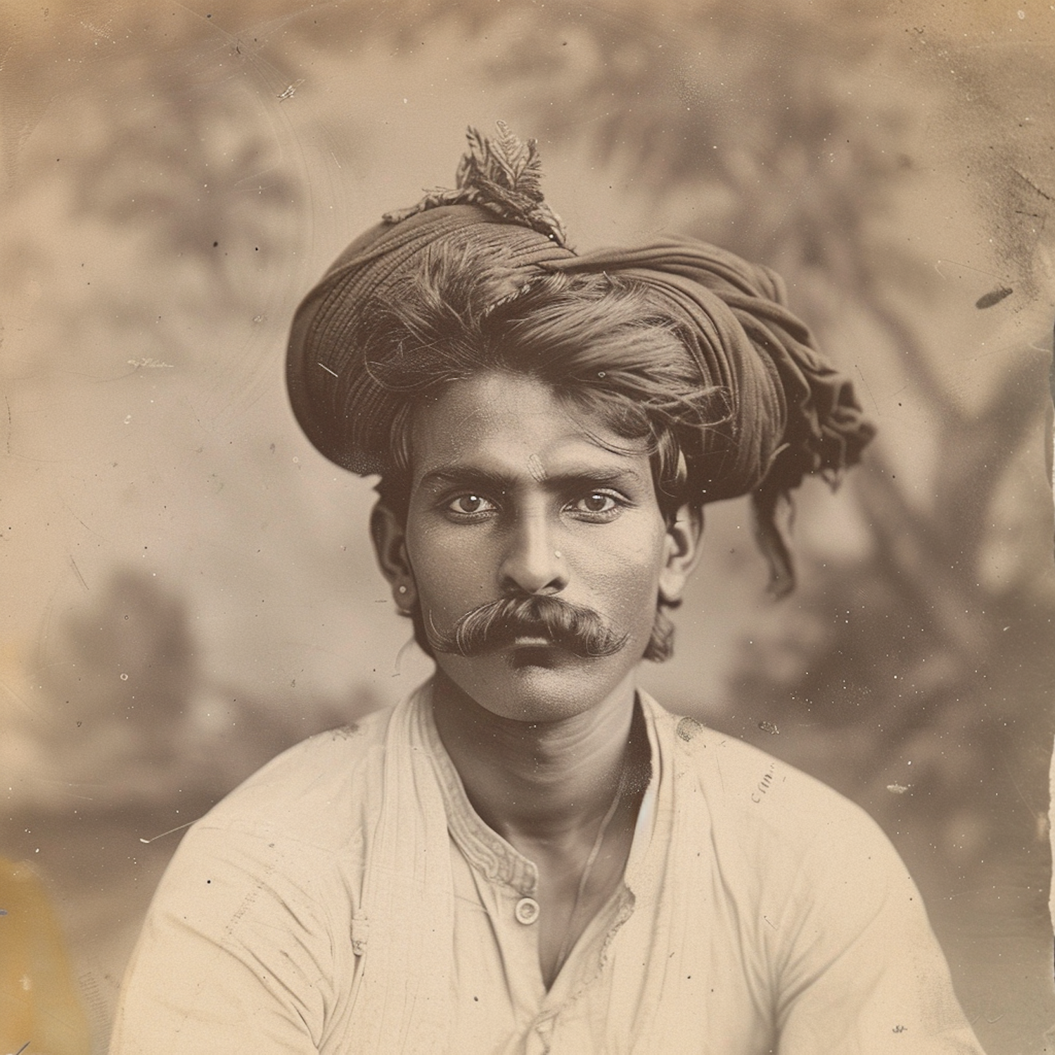 Sepia portrait of a South Asian man with a turban and mustache, wearing traditional attire. His intense gaze adds depth to the historical image.