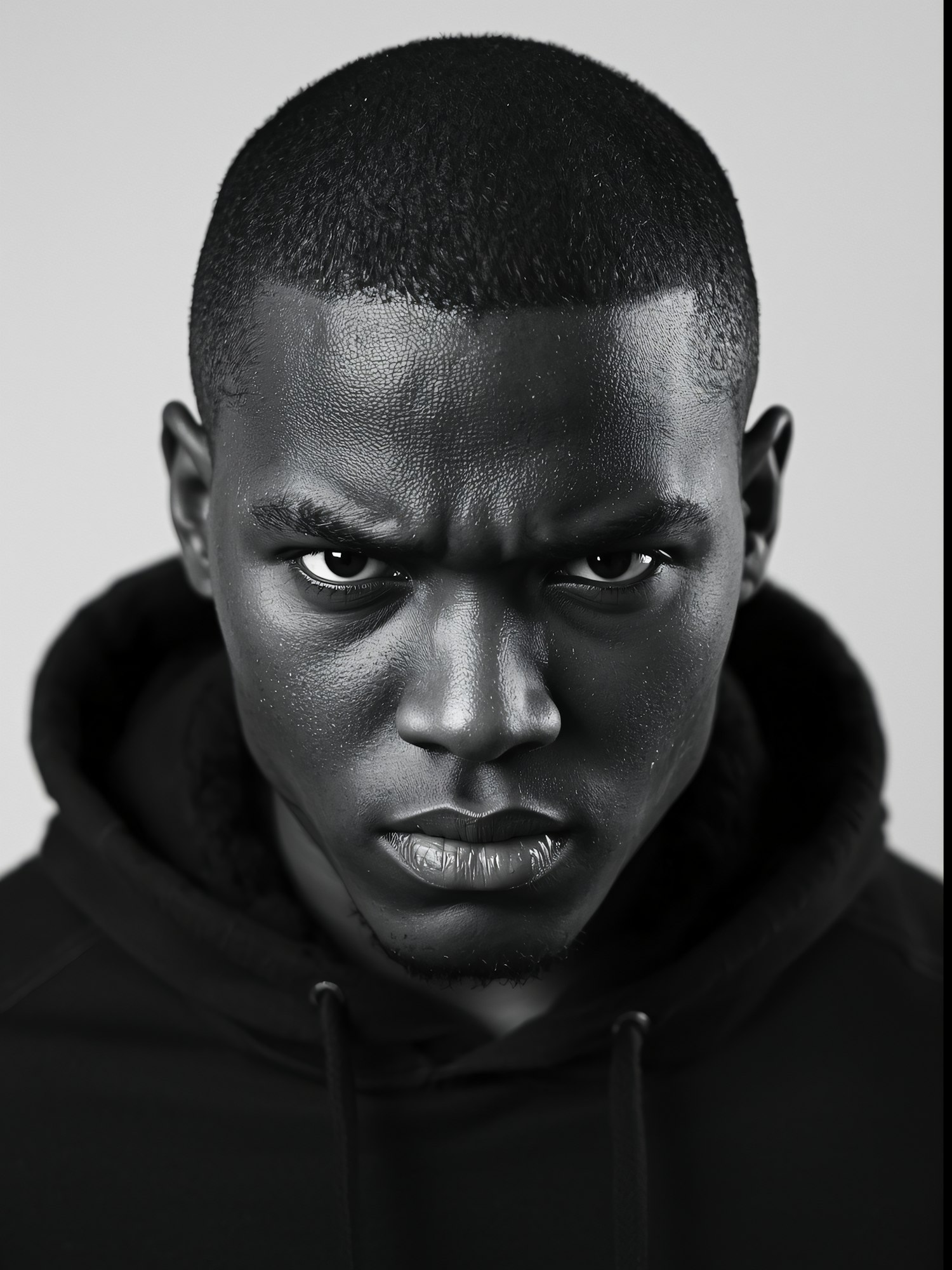 Close-up portrait of a man with a serious expression, wearing a black hoodie, against a neutral background.