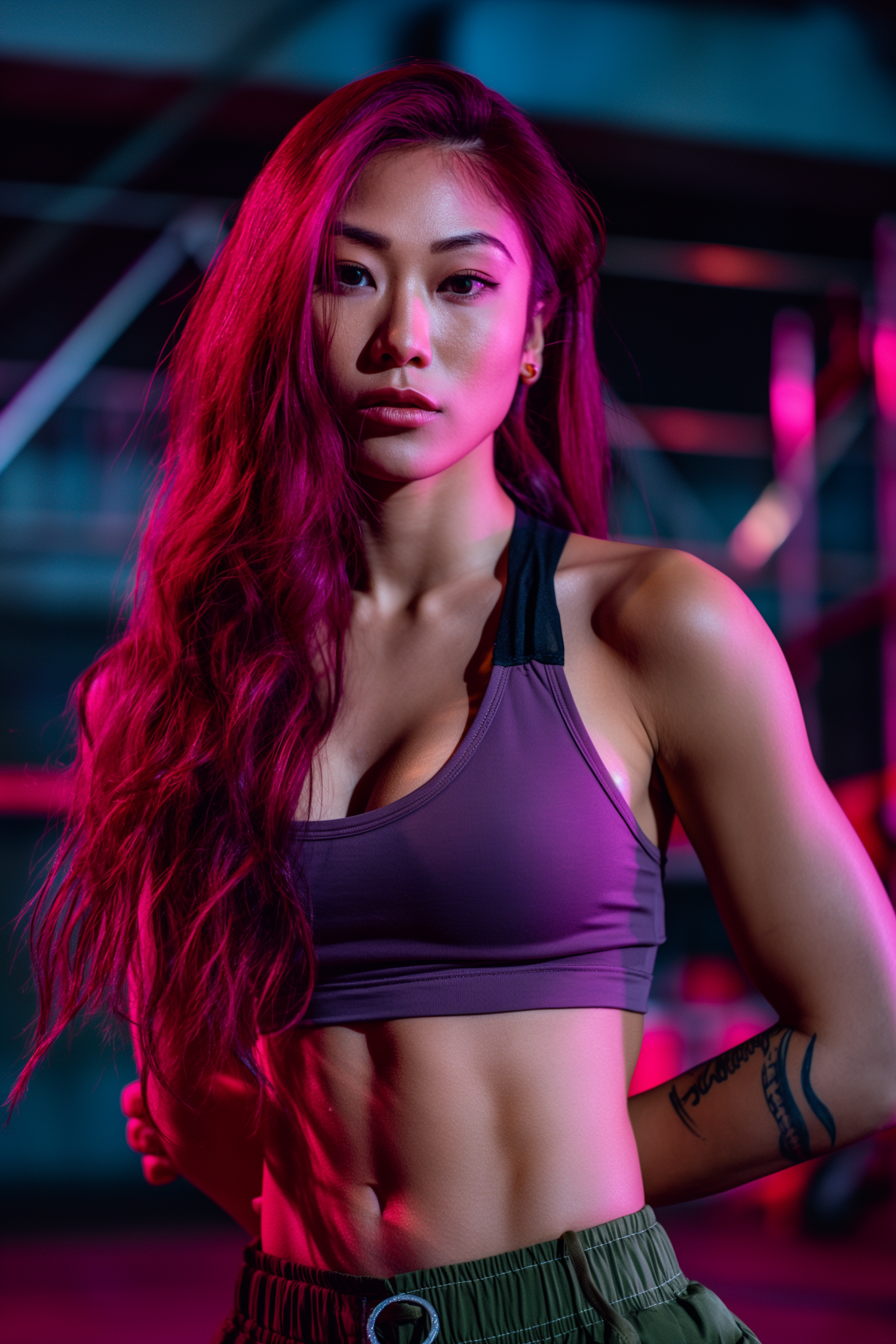 Athletic woman with magenta hair and tattoo in gym, wearing purple sports bra, showcasing toned abs and vibrant energy.