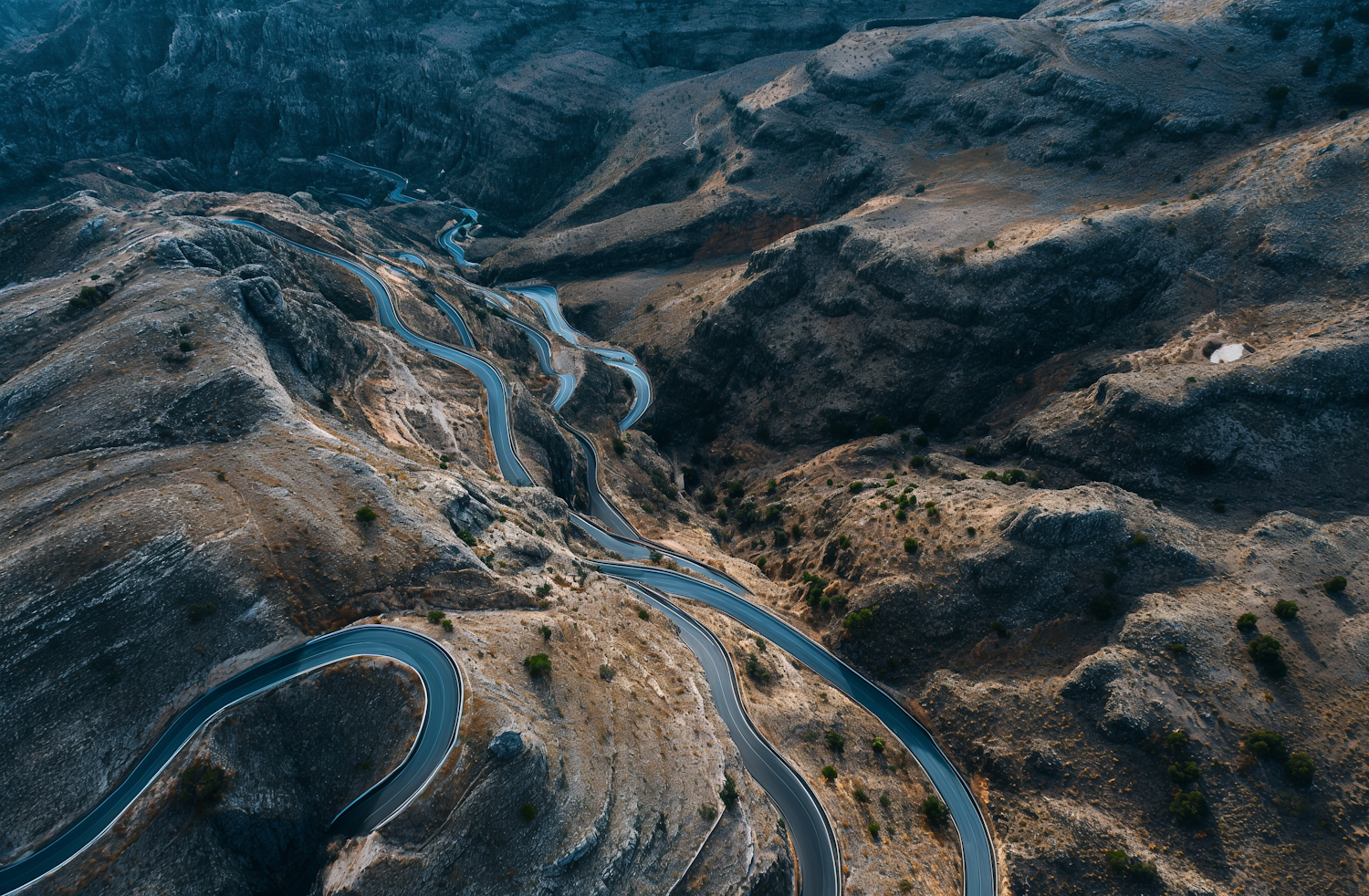 Aerial view of a winding road through rugged mountains, showcasing dramatic curves and barren, rocky terrain.