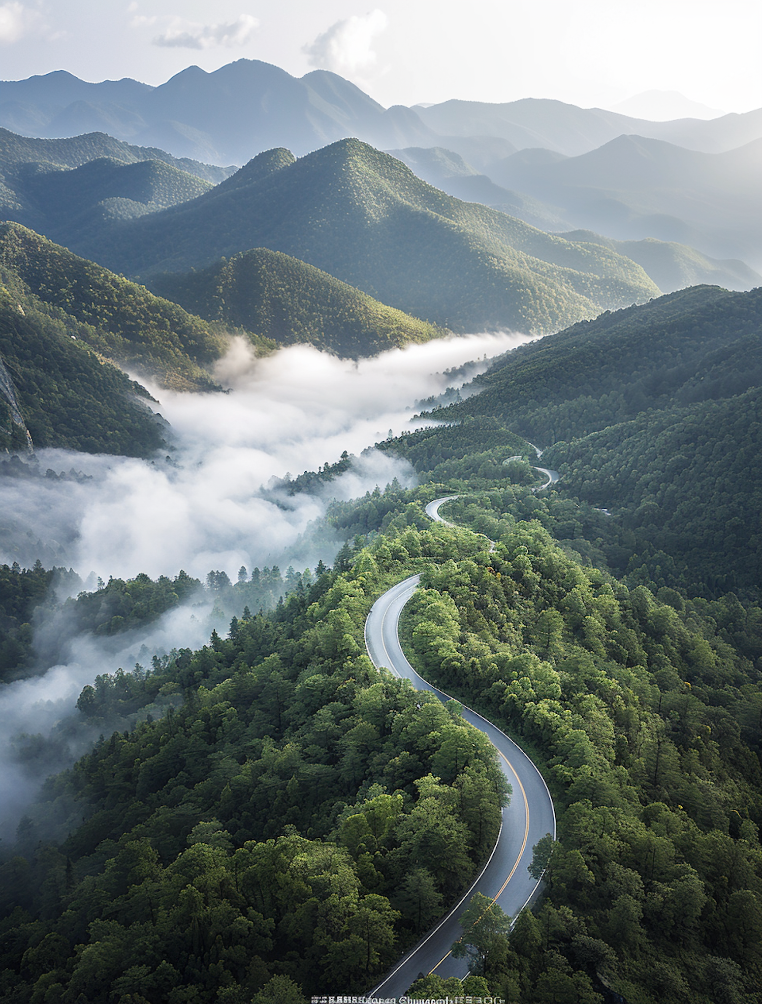 A winding road through lush green mountains with misty clouds, creating a serene and picturesque landscape.