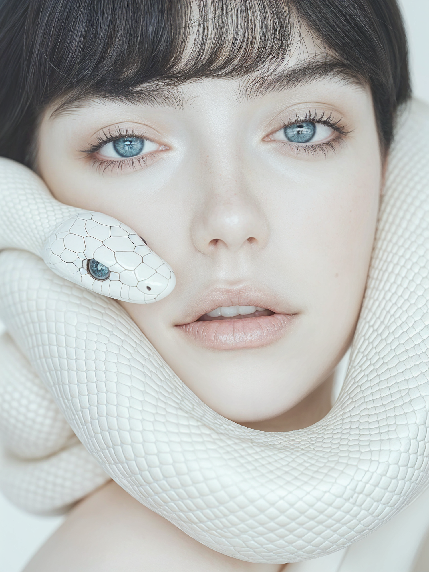 Close-up of a woman with blue eyes and a white snake wrapped around her face, creating a striking and ethereal portrait.