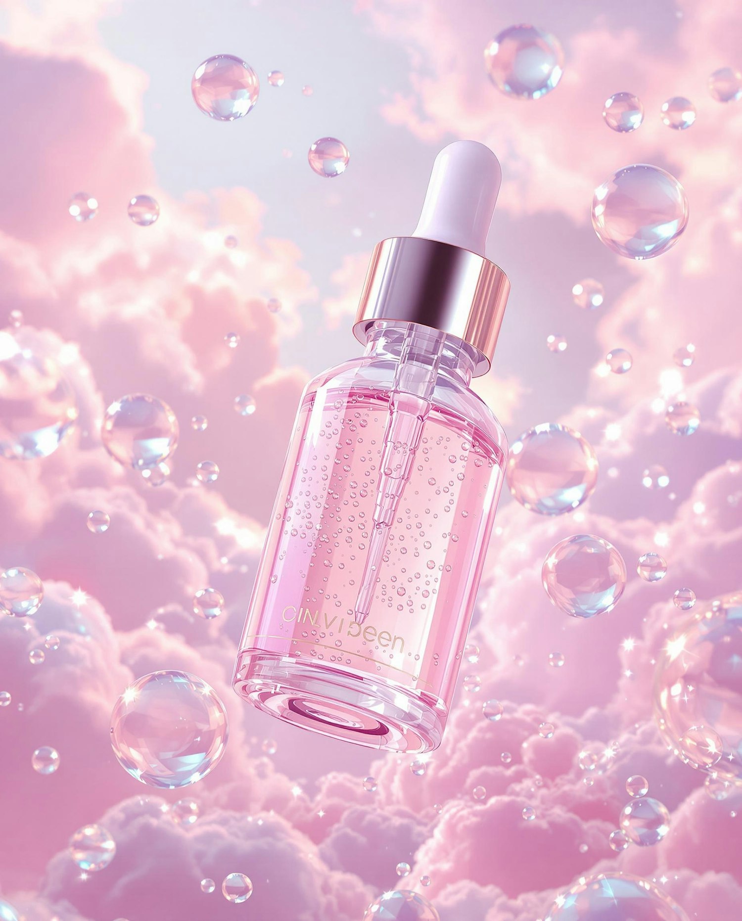 A dreamy, soft-pink scene with a serum bottle floating among clouds and delicate bubbles, exuding elegance and beauty.