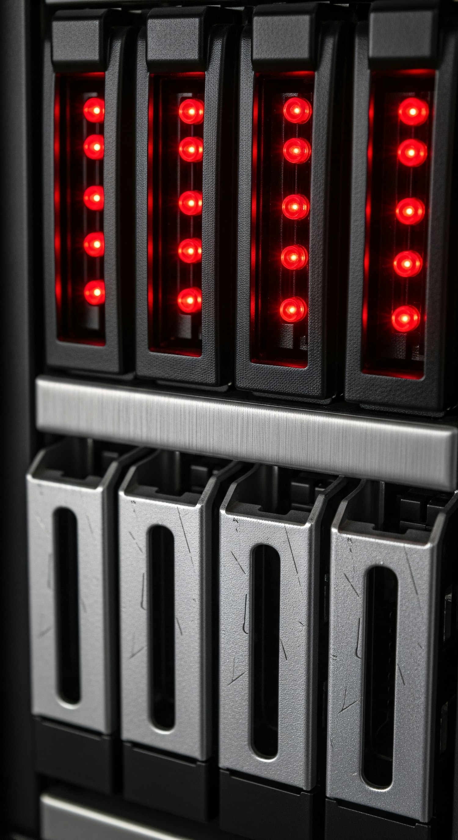 Close-up of a server's hard drive bays with red LED lights and metallic covers, showcasing modern data storage technology.