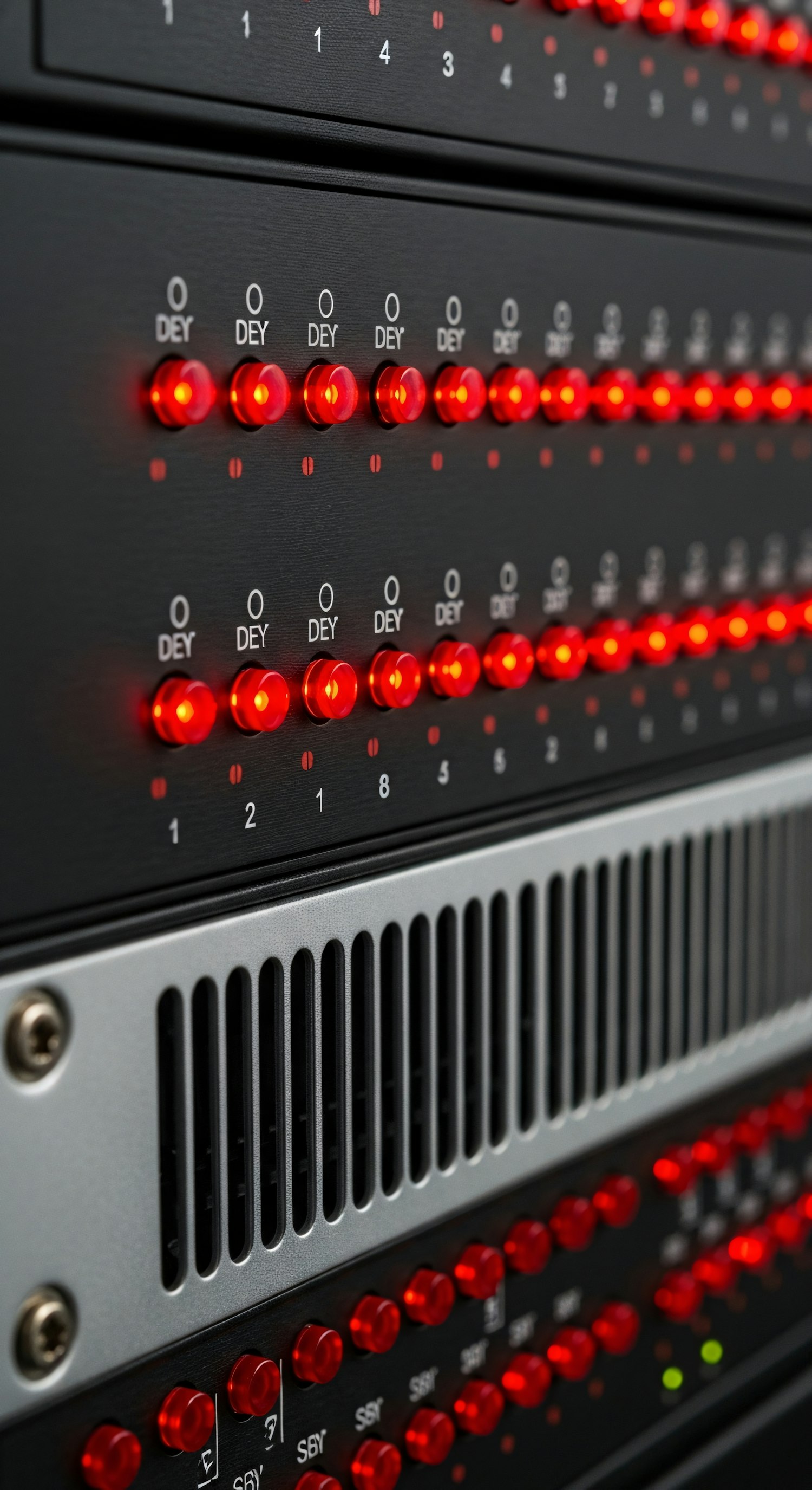 Close-up of a server panel with glowing red and green LED lights, showcasing a sleek black and metallic design with labeled indicators.