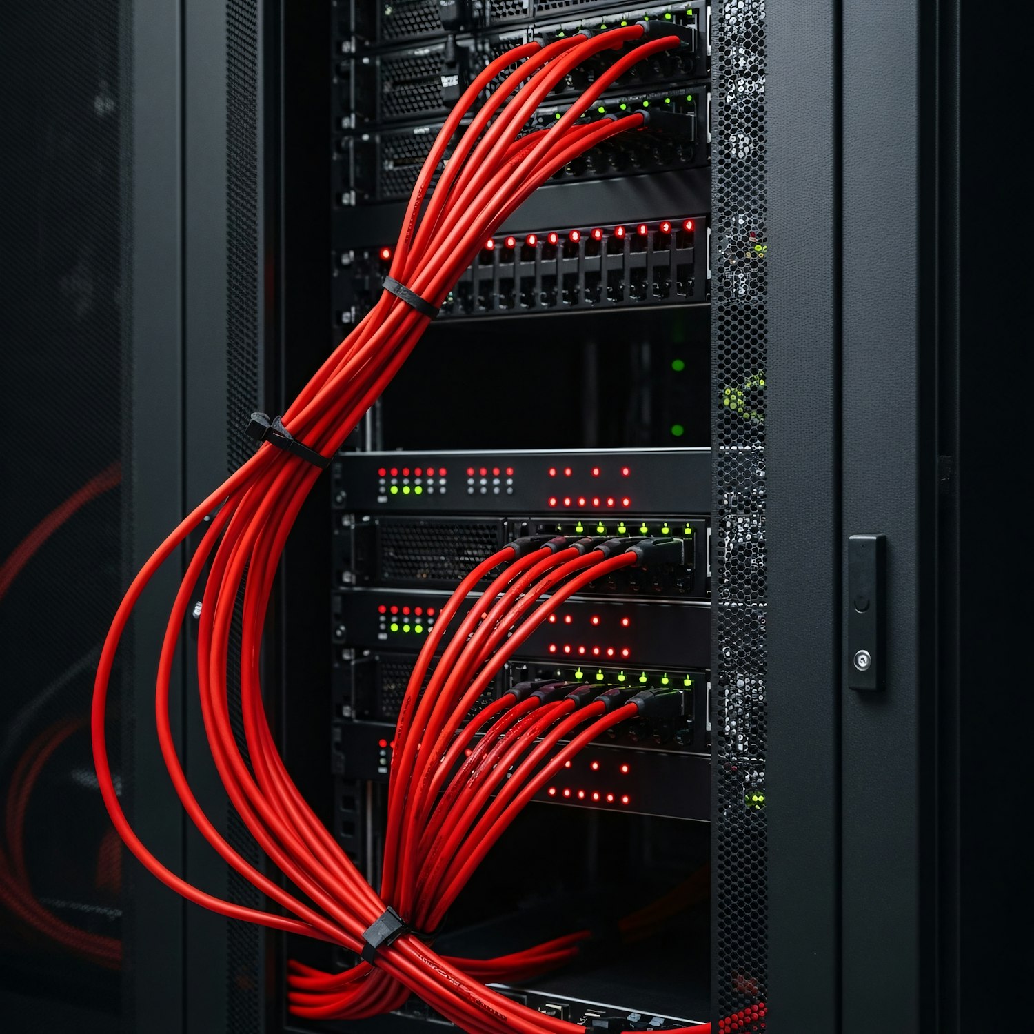 Server rack with red network cables and active status lights, showcasing a clean and organized data center setup.