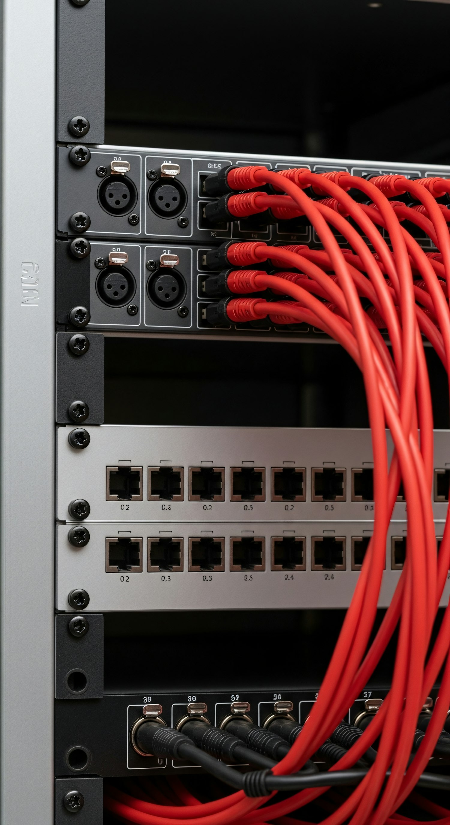 Close-up of a server rack with red cables connected to XLR and Ethernet ports, showcasing a professional networking setup.