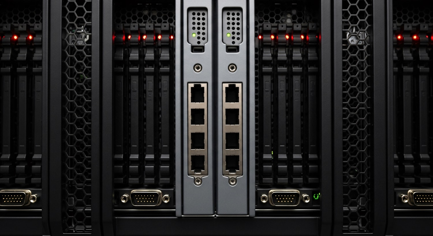 Close-up of a server rack with Ethernet ports, honeycomb ventilation, and indicator lights, showcasing a modern data center setup.