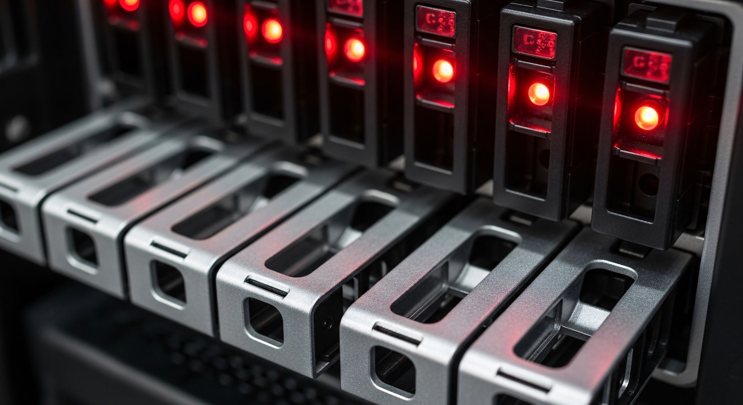 Close-up of a server rack with hard drive bays and glowing red indicator lights, showcasing a sleek and modern data storage setup.