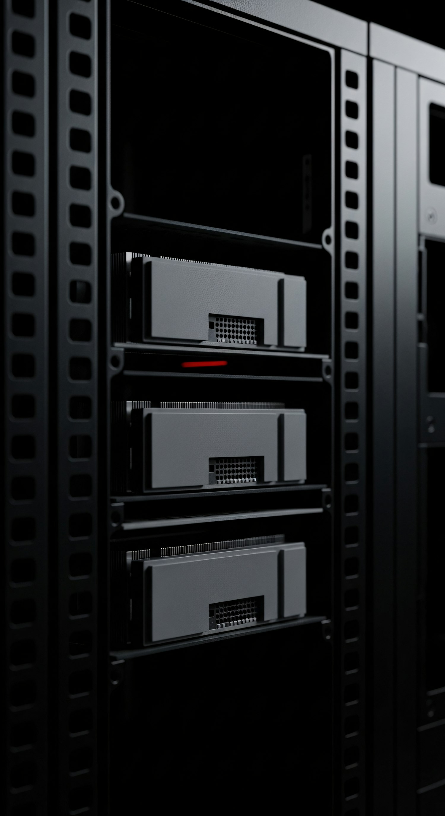 Close-up of a sleek server rack with black units and a red indicator light, showcasing modern data center technology.