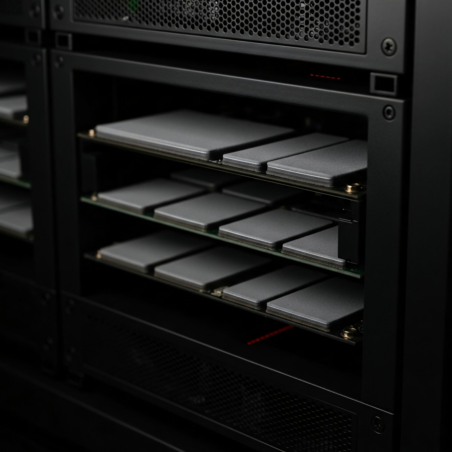 Close-up of a server rack with neatly arranged hardware components, showcasing modern data storage technology in a sleek black enclosure.