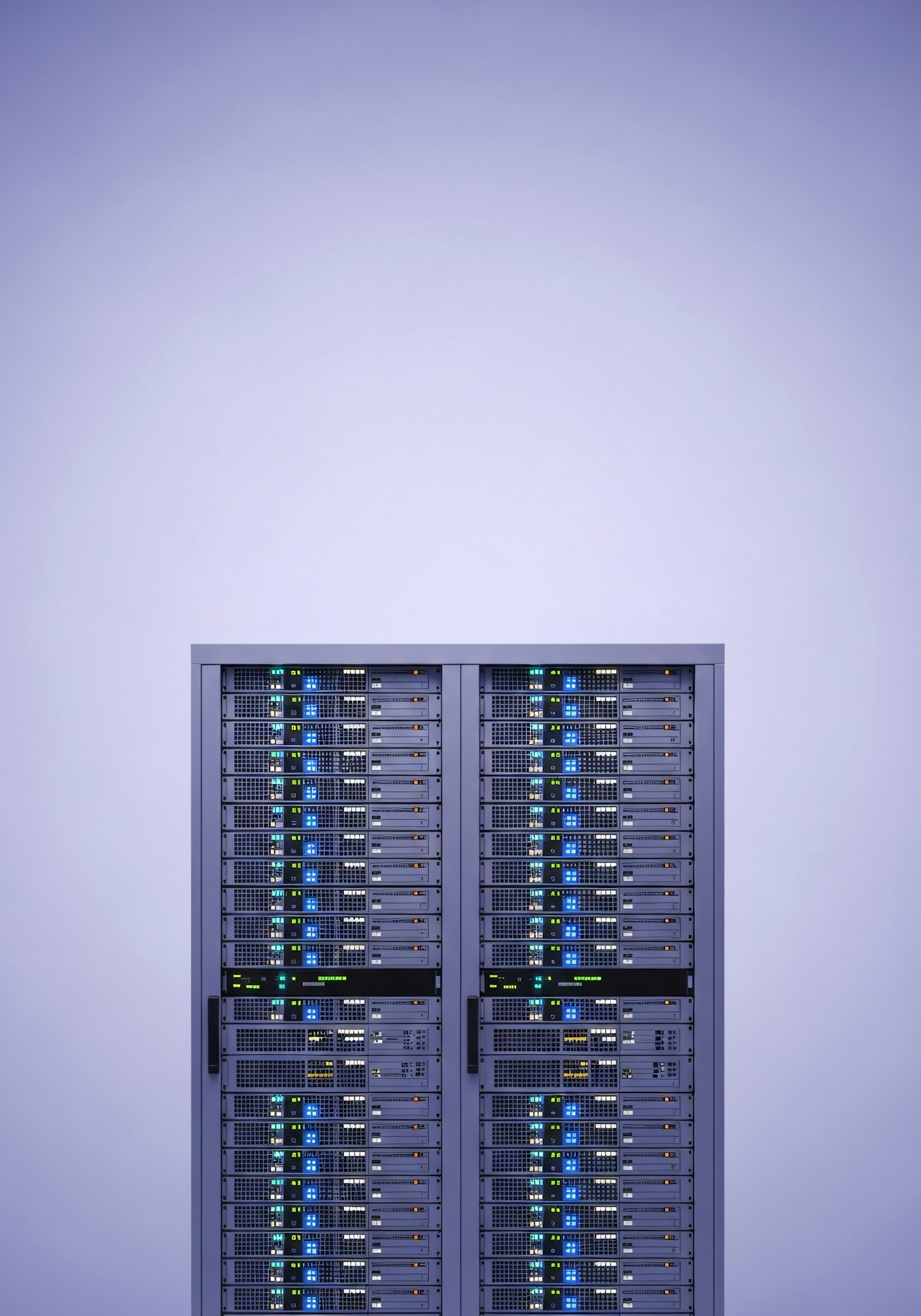 A pair of server racks with organized hardware and indicator lights, set against a clean, light purple background.