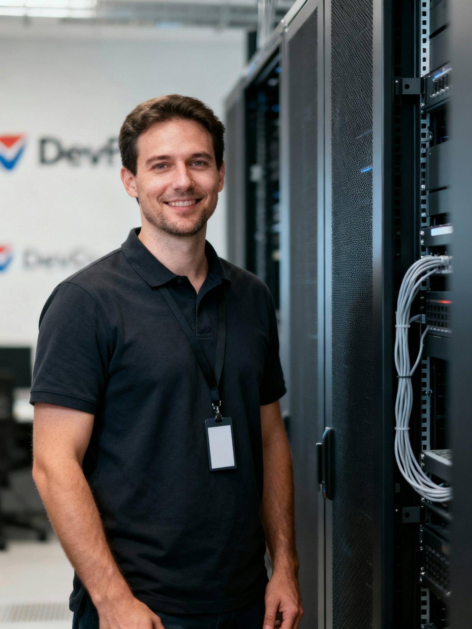 A man in a server room smiles confidently, surrounded by server racks and cables, wearing a black polo and a lanyard with a badge.