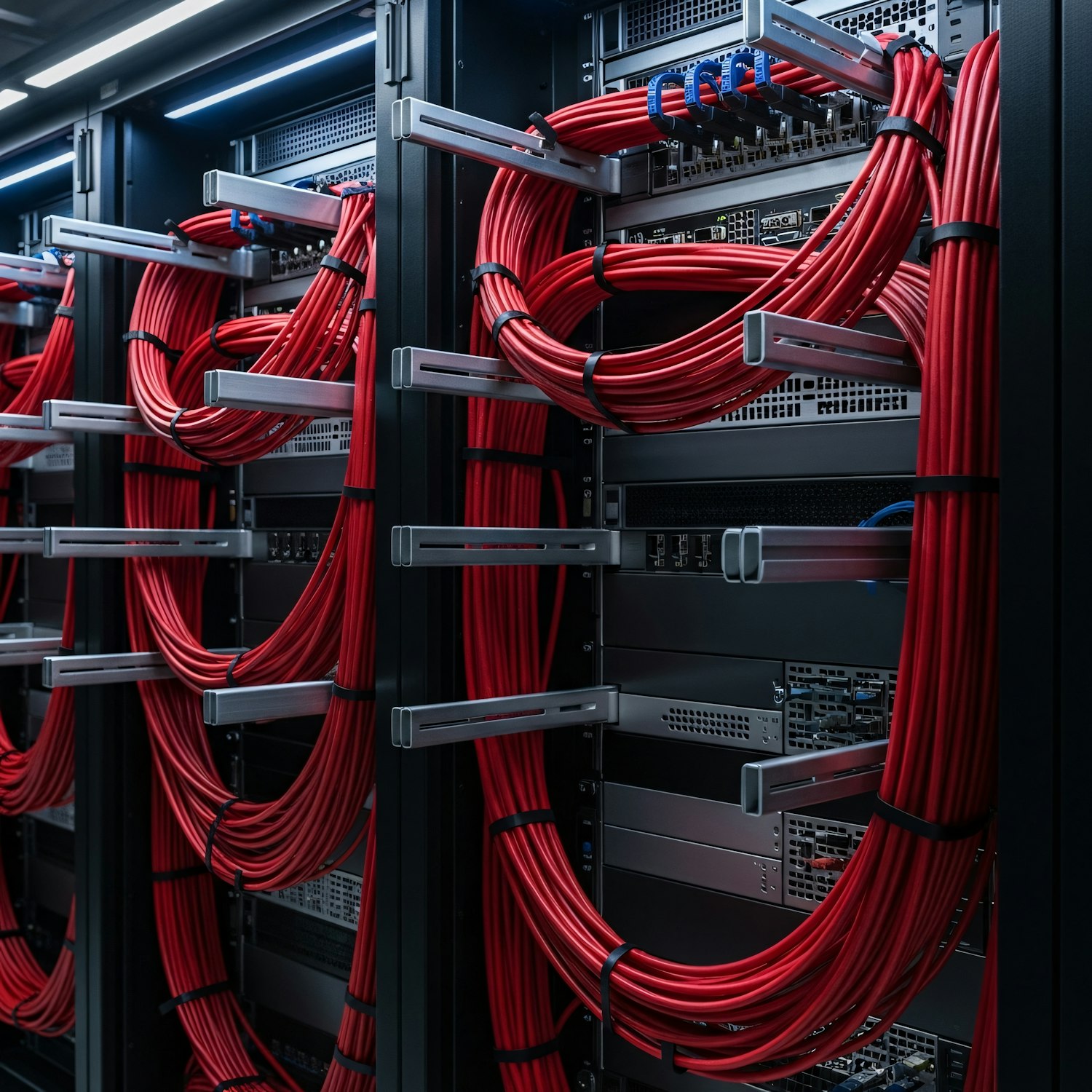 Neatly organized red network cables in a server room, showcasing professional cable management and modern data center equipment.