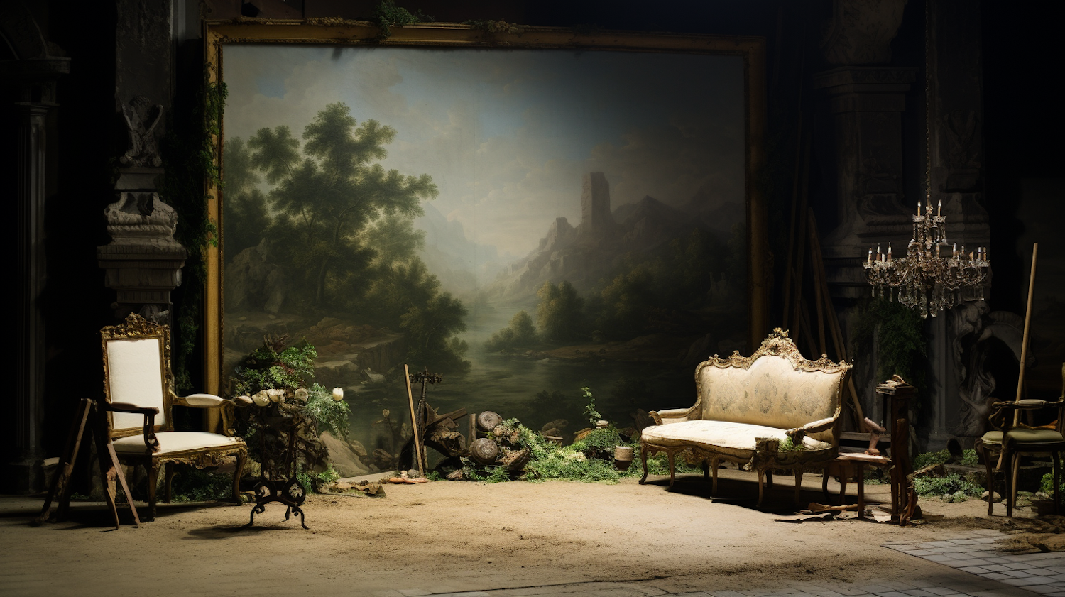 Opulent vintage room with antique furniture, a grand landscape painting, and a crystal chandelier, exuding classical elegance.
