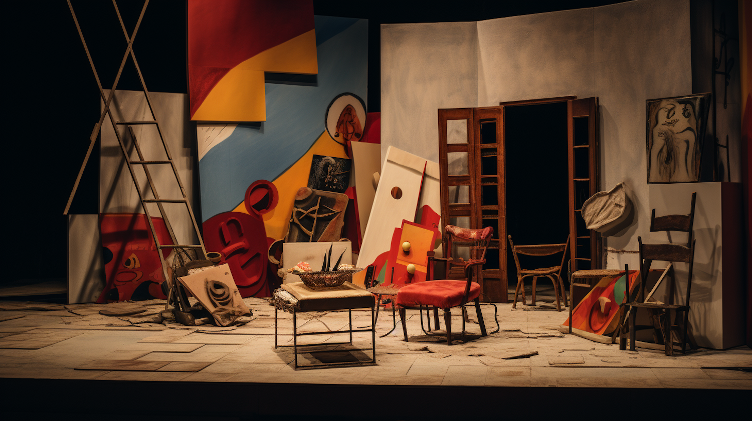 Eclectic stage set with abstract art, colorful props, and vintage furniture, creating a vibrant and artistic atmosphere.