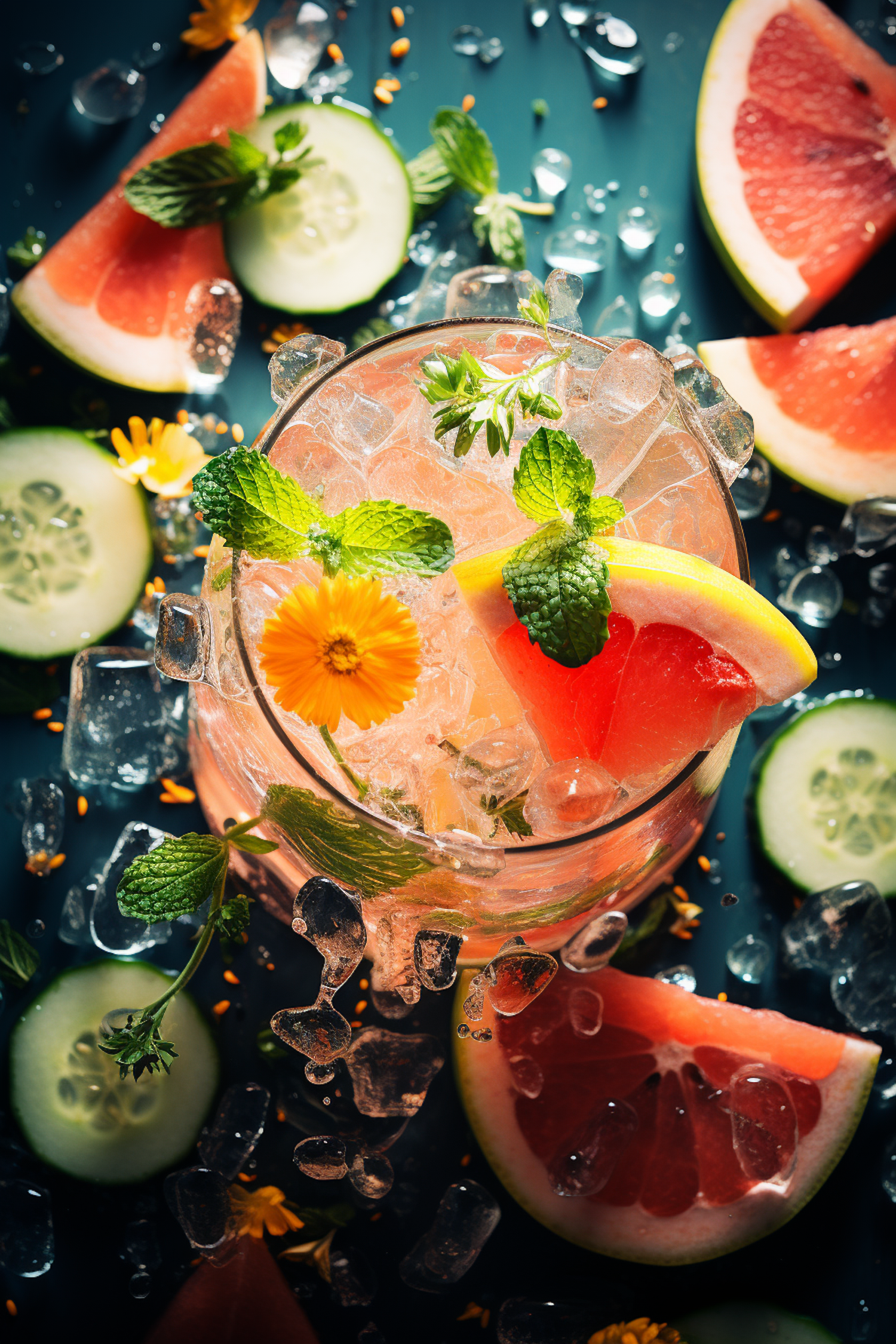 Refreshing cocktail with grapefruit, mint, and cucumber, surrounded by ice cubes and vibrant garnishes. Perfect summer drink.