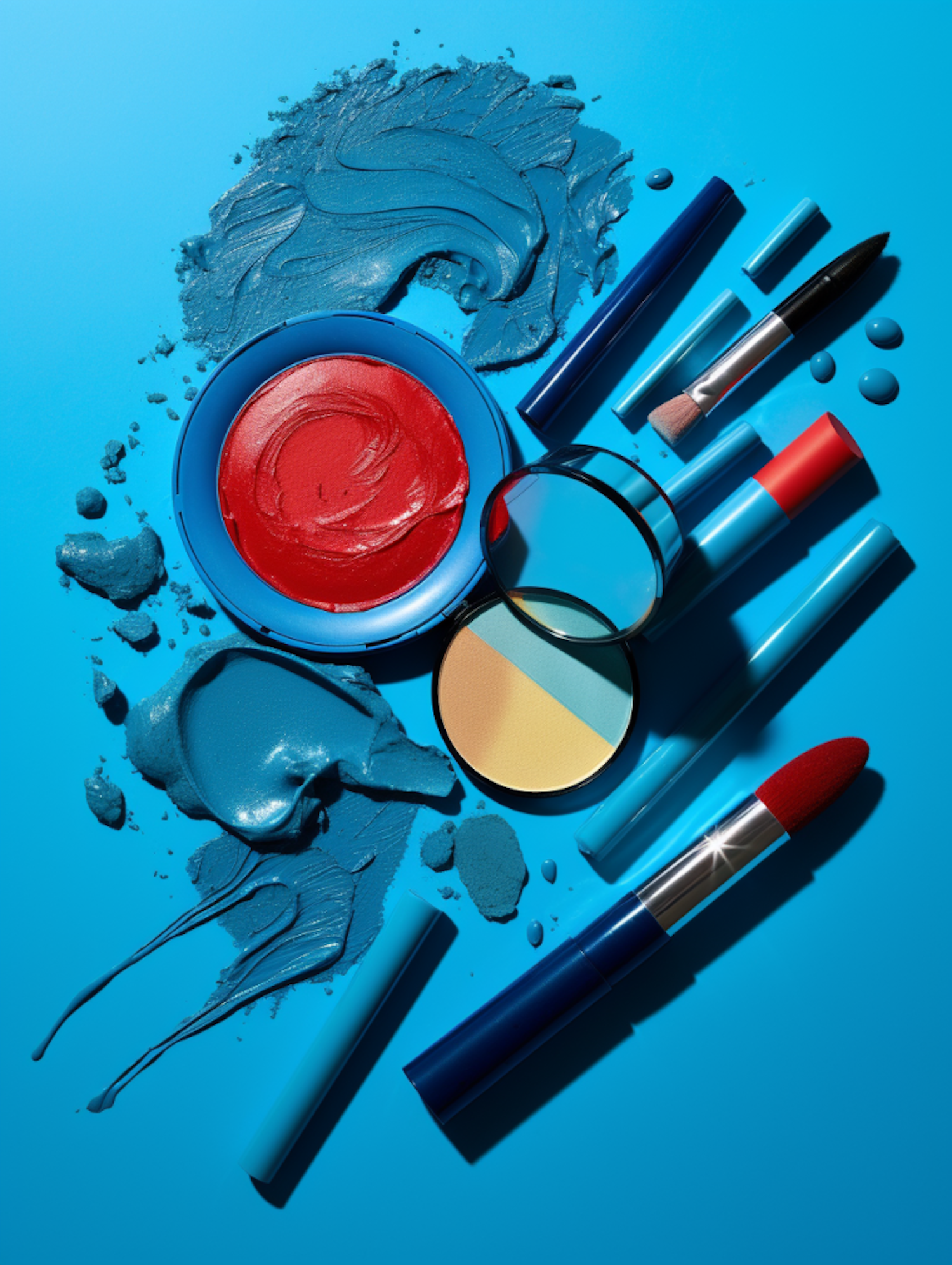 Vibrant makeup arrangement with red and blue cosmetics on a bright blue background, featuring lipstick, eyeshadow, and a brush.