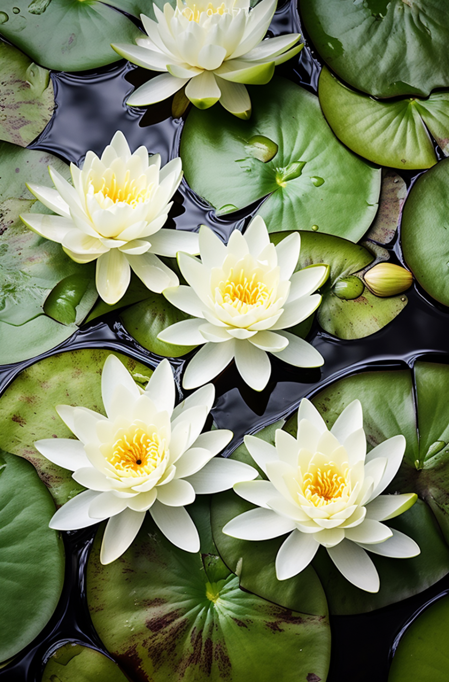 Serene white water lilies in full bloom on a reflective pond, surrounded by lush green lily pads.
