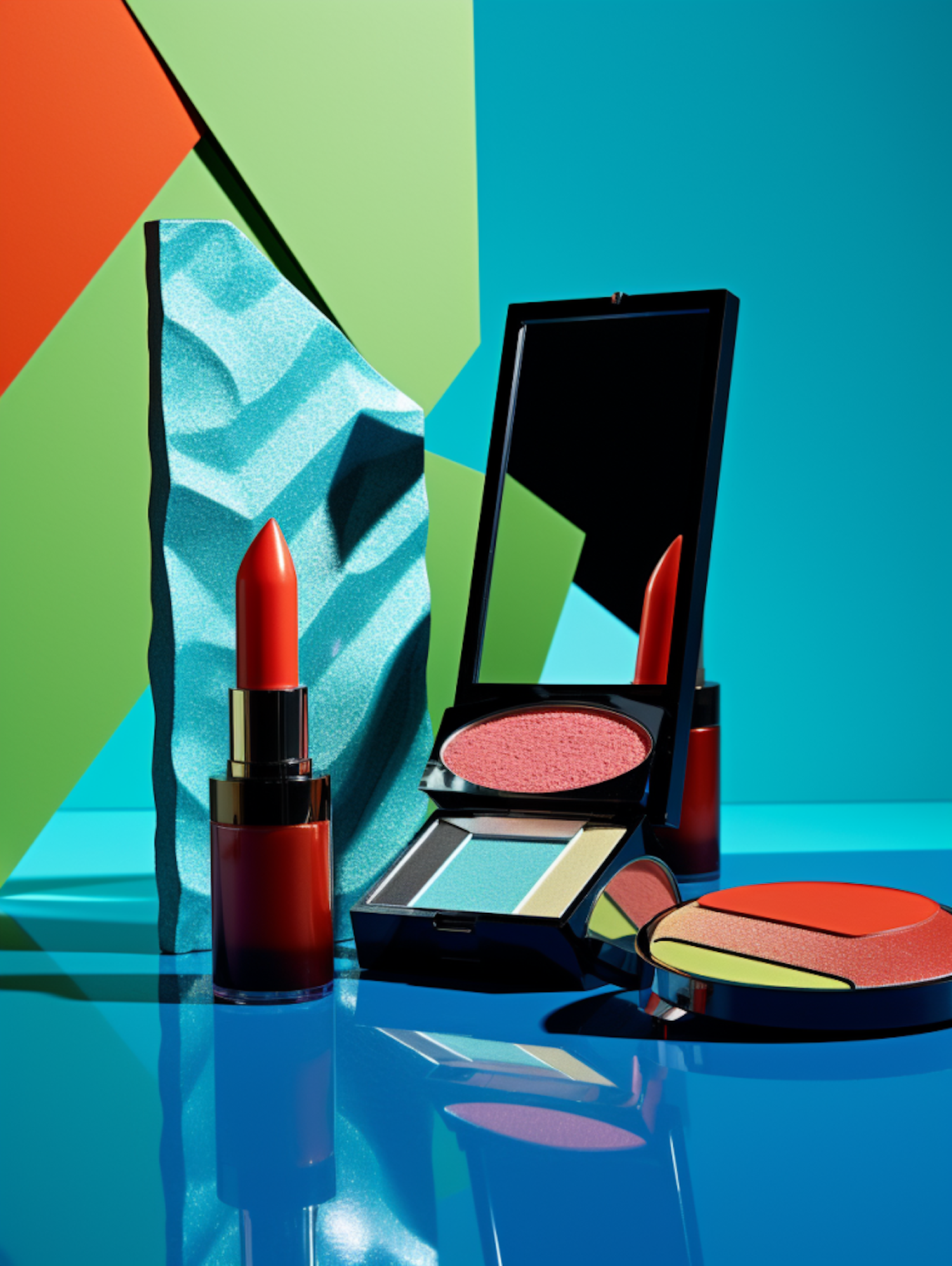 Vibrant makeup display with red lipstick, colorful eyeshadows, and blush against a geometric background.